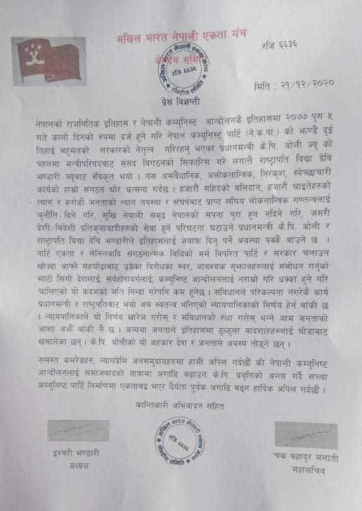 नेपाल कम्युनिष्ट पार्टी नेकपाको भातृ संगठन अखिल भारत नेपाली एकता मञ्चले संसद विघठनको भर्त्सना गर्दै 2077 साल पुष 5 गतेलाई कम्युनिष्ट आन्दोलनको कालो दिनको रुपमा व्याख्या गरेको छ । प्रधानमन्त्री केपी शर्मा ओलीको सिफारिसमा राष्ट्रपतिबाट भएको संसद विगठन असंवैधानिक, अलोकतान्त्रीक, निरकुंश, सवेच्छाचारी कार्य भएको ठहर गरेको छ । सोमबार प्रेस विज्ञप्ति जारी गर्दै अखिल भारत नेपाली एकता मञ्चले पार्टीभित्रको विरोधका स्वरलाई सम्बोधन गर्नुको साँटो सिँगो देश, सर्वहारावर्ग र कम्युनिष्ट आन्दोलनलाई धक्का लाग्ने गरि चालिएको कदमको निन्दा गरेको छ । मञ्चले प्रधानमन्त्री र राष्ट्रपतिबाट संविधान विपरित काम भएको भन्दै अब स्वतन्त्र भनिएको न्यायपालिकाको काम हेर्न बाँकी रहेको भनेको छ । न्यायपालिकाबाट निर्णय खारेज होस भन्ने चाहना आम जनताको भएको मञ्चको भनाई छ । मञ्चले नेपाली कम्युनिष्ट आन्दोलनलाई समाजवादको बाटोमा अग्रसर गराउन केपी प्रवृत्तिको अन्त्य गर्दै सच्चा कम्युनिष्ट निर्माणमा एकताबद्ध भएर धैर्यतापूर्वक अगाडी बढ्न सम्पूर्णमा अपील गरेको छ ।