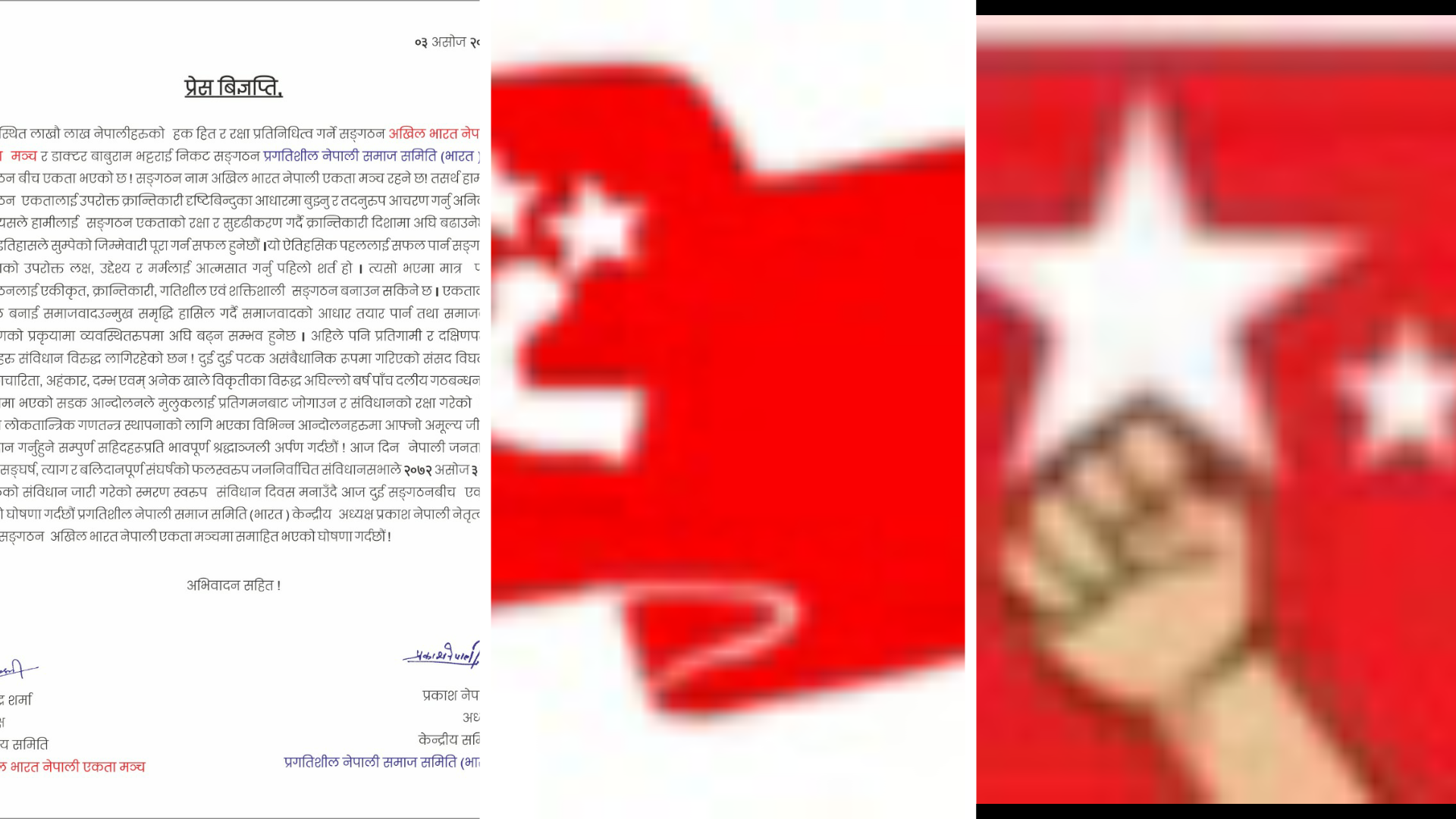 अखिल भारत नेपाली एकता मन्च र बाबुराम भट्टराई निकट संगठन प्रगतिशील नेपाली समाज समिति बीच एकता भएको छ। एकता पश्चात संगठनको नाम अखिल भारत नेपाली एकता मन्च रहने छ। नेशनल लाईभ टिभीलाई प्राप्त विज्ञप्ति अनुसार संगठन एकता लाई उपरोक्त क्रान्तिकारी दृष्टि बिन्दुका आधारमा बुझ्न र तदनरूप आचरण गर्न संगठन एकताको रक्षा र सुदृढीकरण गर्दै क्रान्तिकारी दिशामा अघि बढाउने र इतिहासले हामीलाई सुम्पिएको जिम्मेवारी पूरा गर्न सफल हुने छौं विज्ञप्तिमा उल्लेख छ। एकतालाई सफल बनाई समाजवाद उन्मुख समृद्धि हासिल गर्दै समाजवादको आधार तयार पार्न तथा समाजवाद निर्माणको प्रक्रिया व्यवस्थित रूपमा अघि बढ्न सम्भव हुनेछ। अहिले पनि प्रतिगामी र दक्षिण पन्थि शक्तिहरु संविधान विरुद्ध लागि रहेका छन। दुई दुई पटक असम्वैधानिक रूपमा गरिएको संसद विघटन स्वेच्छा चारिता, अहंकार, दम्भ एवं अनेक खाले विकृतिका विरुद्ध अघिल्लो वर्ष 5 दलीय गठबन्धनको नेतृत्वमा भएको सडक आन्दोलनले मुलुकलाई प्रतिगमन बाट जोगाउन र संविधानको रक्षा गरेको छ। विज्ञप्तिमा अगाडी भनिएको छ आज नेपाली जनताको लामो संघर्ष त्याग र बलिदानपूर्ण संघर्षको फल स्वरूप जन निर्वाचित संविधान सभाले 2072 असोज 3 गते नेपालको संविधान जारी गरेको स्मरण स्वरूप संविधान दिवस मनाउंदै आज दुई संगठनबीच एकता भएको घोषणा गर्दैछौं। प्रगतिशील नेपाली समाज समिति भारत केन्द्रीय अध्यक्ष प्रकाश नेपाली नेतृत्वमा सिंगो संगठन अखिल भारत नेपाली एकता मन्चमा समाहित भएको घोषणा गर्दछौं। अखिल भारत नेपाली एकता मन्चका अध्यक्ष राजेन्द्र शर्मा र प्रगतिशील नेपाली समाज समिति अध्यक्ष प्रकाश नेपालीले उक्त विज्ञप्तिमा हस्ताक्षर गरेका छन। विज्ञप्तिमा पदीय बांडफाड बारे कुनै जानकारी दिइएको छैन।