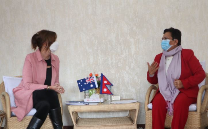 ऊर्जा, जलस्रोत तथा सिँचाइमन्त्री पम्फा भुसालसँग नेपालका लागि अष्ट्रेलियाली राजदूत फेलिसिटी जान भोल्कले शिष्टाचार भेट गरेकी छन्। उनीहरूबीच मन्त्रालयमा भएको भेटमा द्विपक्षीय हित र चासोका विविध विषयमा छलफल भएको हो। सो अवसरमा मन्त्री भुसालले अष्ट्रेलियासँगको साझेदारीलाई नेपालले उच्च महत्व दिएको उल्लेख गर्दै सन् १९६० देखिको द्विपक्षीय घनिष्ट, सौहार्दपूर्ण र मैत्रीपूर्ण सम्बन्धलाई अझ विस्तार गर्दै लैजानुपर्नेमा जोड दिइन्। उनले विश्वले सामना गरिरहेको महामारी र जलवायु परिवर्तनका चुनौती बढ्दै गएकाले आपसी सहकार्य पहिलाभन्दा अझ बढी आवश्यक रहेको उल्लेख गरिन्। राजदूतले नेपाल–अस्ष्ट्रेलिया साझेदारीलाई थप सुदृढ बनाउन निर्वाह गरेको भूमिकाको प्रशंसा गर्दै मन्त्री भुसालले नेपालको आर्थिक तथा सामाजिक विकासमा अष्ट्रेलियाले पुर्याएको सहयोगप्रति धन्यवाद व्यक्त गरिन्। राजदूत भोल्कले नेपालको आर्थिक तथा मानवीय क्षमता अभिवृद्धिका लागि अष्ट्रेलिया सरकारले निरन्तर सहयोग गर्ने विश्वास दिलाइन्। जलस्रोत व्यवस्थापनमा सहकार्य गर्नका लागि नेपालको ऊर्जा, जलस्रोत तथा सिँचाइ मन्त्रालय र अस्ष्ट्रेलियाको ‘कमनवेल्थ साइन्टिफीक एन्ड इन्डस्ट्रियल रिसर्च अर्गनाइजेसन’ (सीएसआईआरओ) बीच सन् २०१७ मा समझदारी भएको थियो। सो सम्झौताअनुसार सीएसआईआरओ र जल तथा ऊर्जा आयोगको सविचालयको साझेदारीमा कमला बेसिनको अवस्थाबारे अध्ययन गरी रणनीति बनाएर कार्यान्वयनमा लगिएको छ।