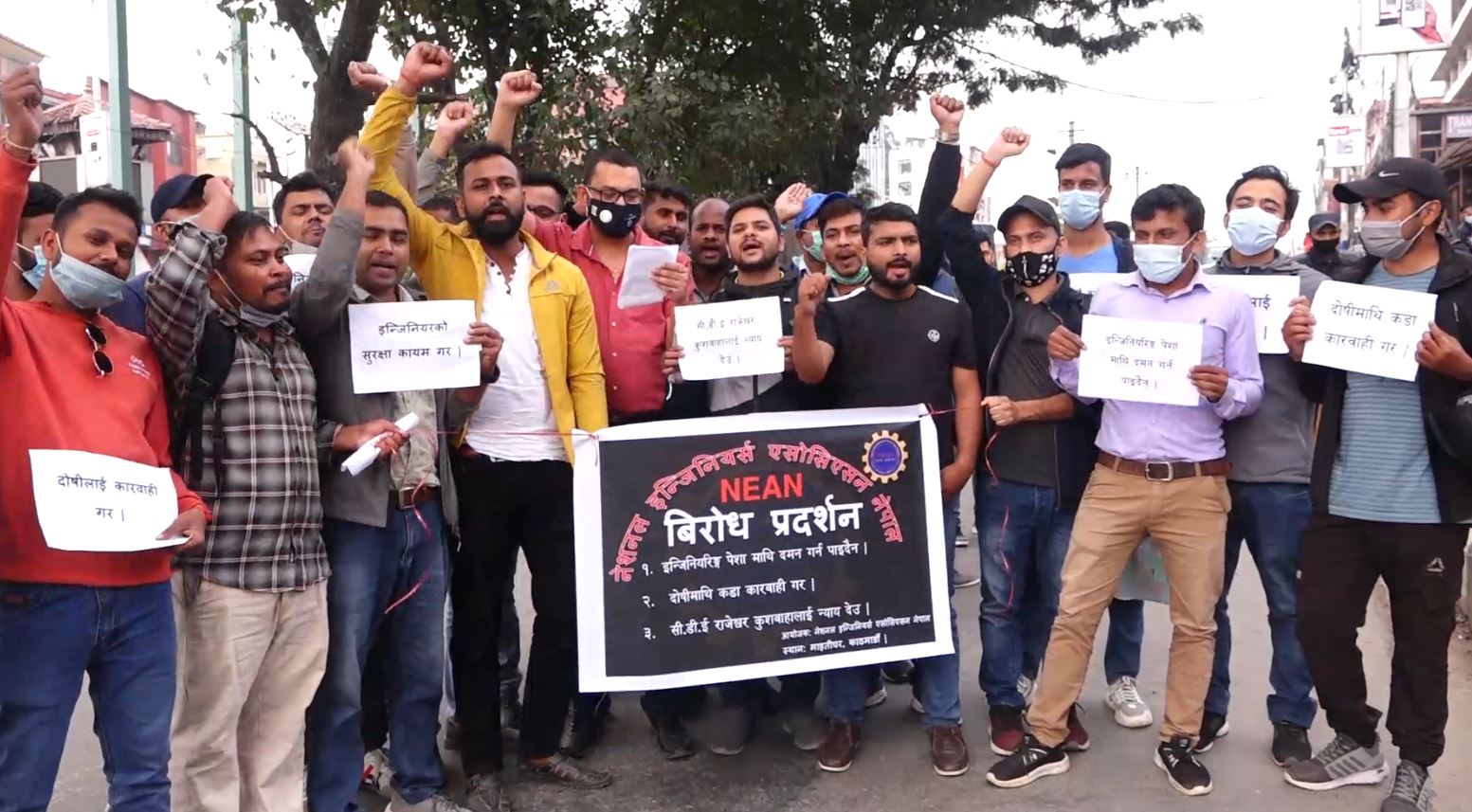 इन्जिनियर पेशामाथिको दमन बन्द गर्न नेशनल इन्जिनियर्स एसोसिएसन नेपालले माग गरेको छ । शनिबार माइतिघर मण्डलामा प्रर्शन गर्दै एसोसिएसनले इन्जिनियरमाथि हुने हरेक दमनलालाई रोक्न माग गरेको हो । सीके राउत नेतृत्वको जनमत पार्टीका कार्यकर्ताले जनकपुरधामस्थित खानेपानी तथा ढल व्यवस्थापन कार्यालय प्रमुख राजेश कुशवाहामाथि दुर्व्यवहार गरेको भन्दै उनीहरुले प्रर्दशन गरेका हुन । उनीहरूले कुशवाहालाई कालोमोसो दलेर नाङ्गै जनकपुरधाम परिक्रमा गराउने कार्य गलत मात्रै नभएर अमानविय भएको बताए । विरोध प्रदर्शनमा नेशनल इन्जिनियर्स एसोसिएसन नेपाल प्रदेश दुईका अध्यक्ष तेजनारायण यादवले प्रदेश २ मा त्रास फैलिएको भन्दै के नेपालमा सिके राउत राज चलनेको हो त ? भन्दै प्रश्न समेत गर्नुभयो । कुशवाहालाई यदि राज्यले न्याय नदिए आफुहरुले आन्दोलन चर्काउने उहाँले चेतावनी दिनुभयो । राउतका कार्यकर्ताले जनकपुरधामको ढल व्यवस्थापन र सरसफाईको व्यवस्थापनमा चासो नदेखाएको भन्दै खानेपानी तथा ढल व्यवस्थापन प्रमुख राजेश कुशवाहामाथि दुर्व्यवहार गरि कालोमोसो दलेर नगर परिक्रमा गराएका थिए । प्रदर्शनकारीहरुले इज्निनियरहरुमाथि दमन गर्न पाइदैन, पीडितलाई न्याय दे लगायतका नारा लगाएका थिए ।