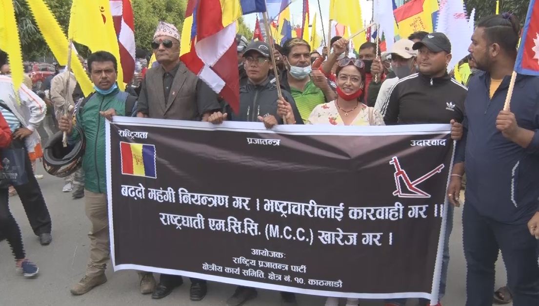 एमसीसी खारेजी तथा महंगी नियन्त्रण गर्नुपर्ने, भ्रष्टाचारीलाई कारवाही गर्नुपर्ने भन्दै राष्ट्रिय प्रजातन्त्र पार्टी (राप्रपा)ले काठमाडौंमा बिरोध प्रदर्शन गरेको छ । काठमाडौंको माइतिघरबाट सुरु भएको प्रदर्शन नयाँ बानेश्वर पुगेर समापन भएको थियो । प्रर्दशनकारीले अमेरिकी सहायता परियोजना (एमसीसी) राष्ट्रघाती भएको भन्दै त्यसको खारेजी गर्नुपर्ने भन्दै नारावाजी गरेका थिए । त्यस्तै उनीहरुले महङ्गी नियन्त्रण गर, भष्ट्राचारीलाई कारवाही गर लगाएतका नारा लगाएका थिए । प्रदर्शनपछि राप्रपाले एमसीसी खारेजीका साथै महंगी नियन्त्रण गर्नुपर्ने लगाएतका माग राख्दै काठमाडौंका प्रमुख जिल्ला अधिकारीमार्फत प्रधानमन्त्री शेरबहादुर देउवालाई ज्ञापनपत्र समेत बुझाएका थियो ।