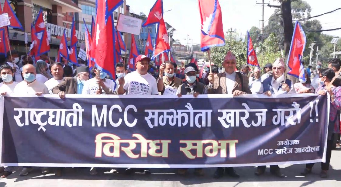 एमसीसी खारेज आन्दोलन अभियानले एमसीसी सम्झौताको संसदीय अनुमोदन प्रक्रिया रद्द गर्नुपर्ने र एमसीसी कार्यन्वयन सम्झौता खारेजीको माग गर्दै शुक्रबार काठमाडौंमा प्रदर्शन गरेका छन् । एमसीसी मुलुकको हितमा नरहेको भन्दै अभियानले काठमाडौंको माइतिघरमा प्रदर्शन गरेका हुन् । प्रदर्शनमा सहभागीहरुले नो एमसीसी, राइट टु रिजेक्ट, राइट टु रिकल लेखिएका प्लेकार्ड प्रदर्शन गरेका थिए । एमसीसी खारेज आन्दोलनका अभियान्ता बालकृष्ण न्यौपानेले मुलुकको हित बिपरित एमसीसीलाई सदनबाट अघि बढाउने तयारी भएको भन्दै मुलुकको हितका लागि बिरोध प्रदर्शन गर्नुपरेको बताउनुभयो । उनीहरुले एमसीसी देशका लागि राष्ट्रघाती हुने र यसले नेपाललाई विदेशी शक्तिको रणभूमि बनाउने तर्क समेत गरेका छन् ।
