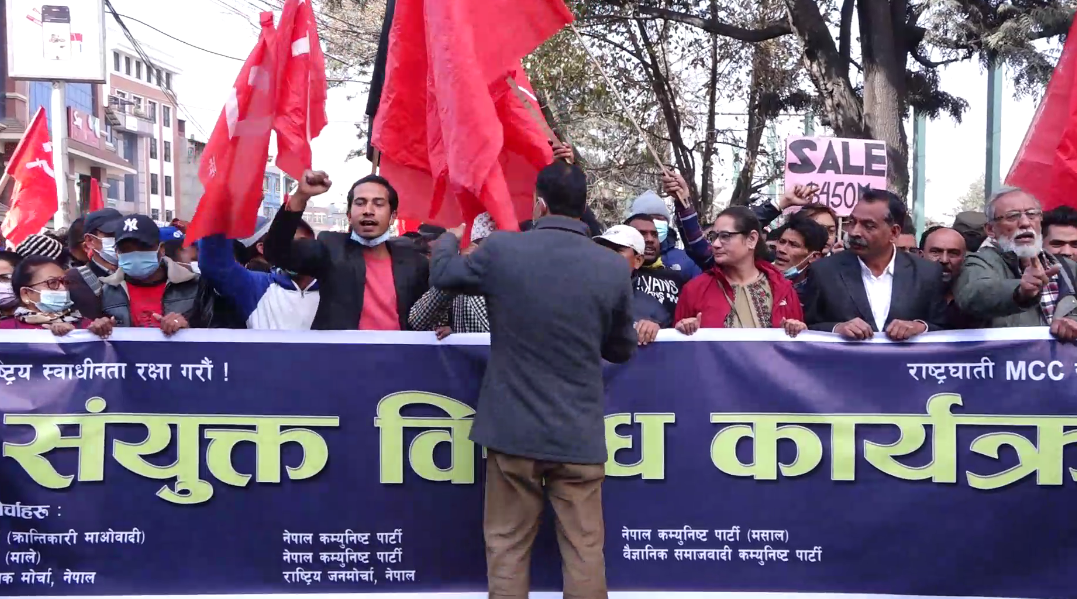 बिभिन्न दल आवद्ध मोर्चाले मिलिनियम च्यालेञ्ज कर्पोरेसन (एमसीसी) विरुद्ध काठमाडौंमा विरोध प्रदर्शन गरेको छ । एमसीसी राष्ट्रघाती भएको भन्दै नेपाल कम्युनिष्ट पार्टी क्रान्तिकारी माओवादी, नेकपा माले,  नेकपा मसाल, नेपाल कम्युनिष्ट पार्टी, नेकपा, राष्ट्रिय जनमोर्चा नेपाल र देशभक्त जनगणतान्त्रिक मोर्चा नेपालले काठमाडौंमा विरोध प्रदर्शन गरेका हुन् । प्रदर्शनका क्रममा उनीहरुले राष्ट्रिय स्वाधीनता रक्षा गरौं, राष्ट्रघाती एमसीसी सम्झौता खारेज गर लगाएतका नारा लगाएका थिए । विरोधपछि आयोजित सभामा नेताहरुले देशभक्तहरुले एमसीसीको विरोध गर्नुपर्ने बताएका थिए । नेकपा (माले) का महासचिव सीपी मैनालीले एमसीसीमार्फत् अमेरिकाले नेपाललाई सैन्य रणनीतिको रुपमा प्रयोग गर्न खोजको तर्क गर्नुभयो । त्यस्तै, नेकपा (क्रान्तिकारी माओवादी) का नेता सिपी गजुरेलले एमसीसी नेपालीहरुका लागि धोका भएको भन्दै एमसीसी सम्झौता खारेज नभएसम्म आफुहरु चूप लागेर नबस्ने बताउनुभयो। सदनबाट एमसीसी पारित हुने अवस्था नरहेको दावी गरेका थिए ।