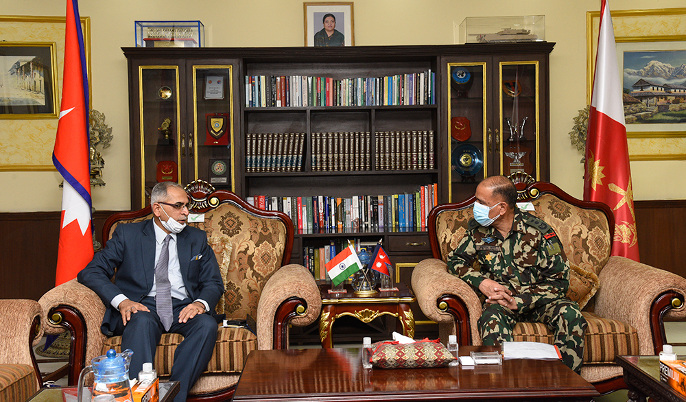 कायम मुकायम प्रधानसेनापति रथी प्रभुराम शर्मा र नेपालका लागि भारतीय राजदूत विनयमोहन क्वात्राबीच शिष्टाचार भेटवार्ता भएको छ। शुक्रबार जंगी अड्डास्थित प्रधानसेनापति शर्माको कार्यकक्षमा भएको भेटवार्तामा दुई पक्षीय आपसी हित तथा पारस्परिक सम्बन्धका विषयमा छलफल भएको थियो। यस किसिमको भेटवार्ताले दुई देशबीचको आपसी सम्बन्धलाई सुमधुर एवं प्रगाढ बनाउन थप मद्दत पुग्ने विश्वास नेपाली सेनाले लिएको बताइएको छ।