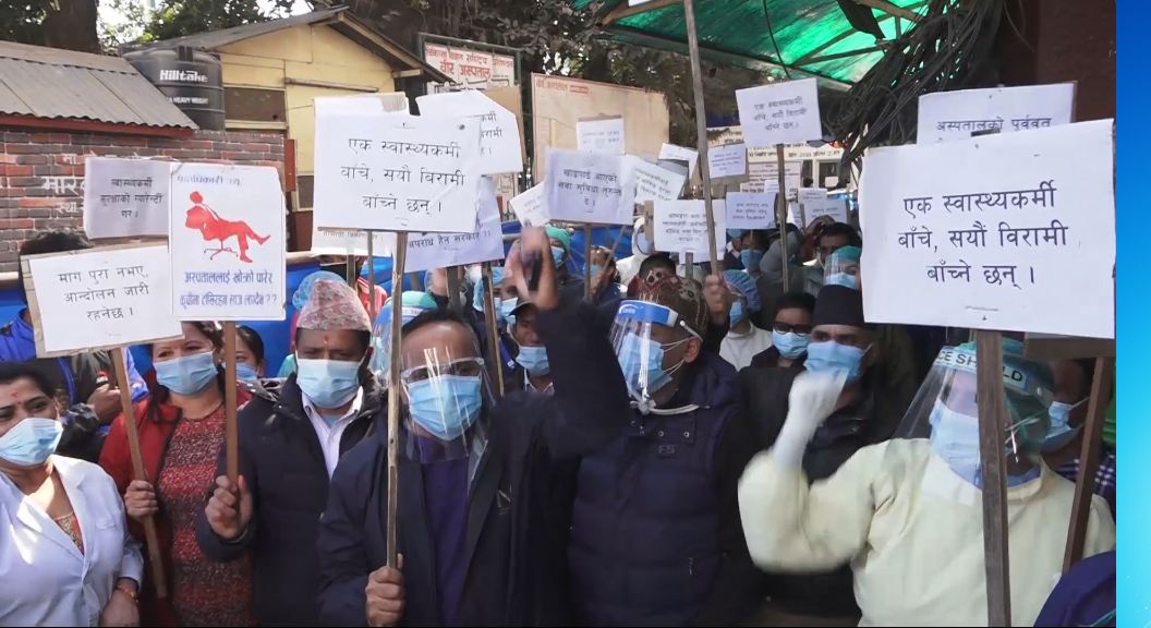 विभिन्न माग राख्दै आन्दोलनमा उत्रिएका वीर अस्पतालका स्वास्थ्यकर्मीहरुको आन्दोलन ३१ औं दिन पनि जारी रहेको छ। कोभिड भत्ता समयमै दिनुपर्ने, यसअघि खाइपाइ आएको सेवा सुविधा कटौती गर्न नहुने, तलब समयमा उपलब्ध गराउनुपर्ने माग राख्दै आएका स्वास्थ्यकर्मीहरुले ३१ औं दिनमा आन्दोलन जारी राखेका हुन् । कोरोना भाइरस संक्रमित विरामीहरुको उपचारमा अहोरात्र खटिएर काम गरिरहेका चिकित्सकहरुको मनोबल गिराउने काम सरकार गरेको उनीहरुको आरोप छ । आफुहरुले पाउँदै आएको सेवा सुविधा कटौती गर्न नपाइने, कोभिड भत्ता समयमा उपलब्ध गराउनुपर्ने लगायतका माग राख्दै कात्तिक २ गतेबाट सुरु भएको आन्दोलन ३१ औं दिनमापनि जारी रहेको नेपाल चिकित्सक संघ वीर अस्पतालका अध्यक्ष खुबराज आचार्यले बताउनुभयो ।
