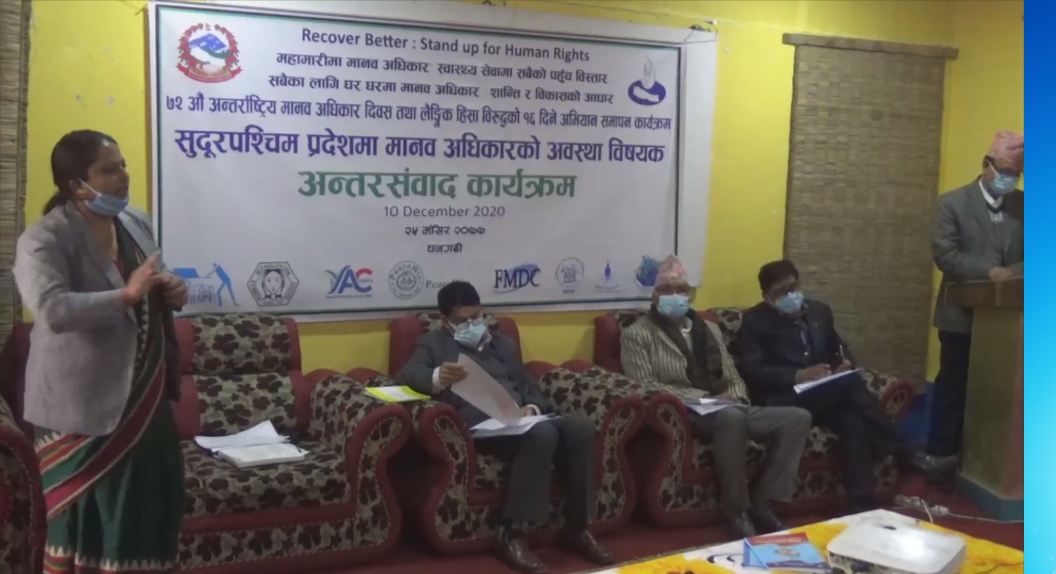 कोरोना भाइरसको महामारीका बेलामा सुदूरपश्चिम प्रदेशमा आत्महत्या र हत्या हिंसाका घटनाहरु बढेका छन। यसले मानव अधिकारको विषयमा चिन्ता बढेको मानव अधिकारकर्मीहरुले बताएका छन। मानव अधिकार सम्बन्धी ऐन नियमहरुको प्रभावकारी कार्यान्वयन गर्न सके हिंसा हत्याका घटनाहरुमा न्यूनीकरण हुन सक्ने उनीहरुको भनाई छ । कोरोना भाइरसको महामारी पछि मानव अधिकार उलंघनका घटनामा बढेका छन। गत वर्षको चैत महिनामा लकडाउन शुरु भए यता कार्तिक मसान्तसम्म सुदूरपश्चिममा २ सय ७६ जनाले आत्महत्या गरेका छन भने १ सय ६० बलात्कारका घटना भएका छन। यस्तै ५८ बलात्कार प्रयास, १६ लैगिंक हिंसा र सबै भन्दा धेरै ५ सय २५ घरेलु हिंसाका घटना सार्वजनिक भएका छन् । मानव अधिकारकर्मी चित्रा पनेरुले यो अवधिमा अन्य समयमा भन्दा हिंसाका घटना बढेको बताउनुभयो ।
