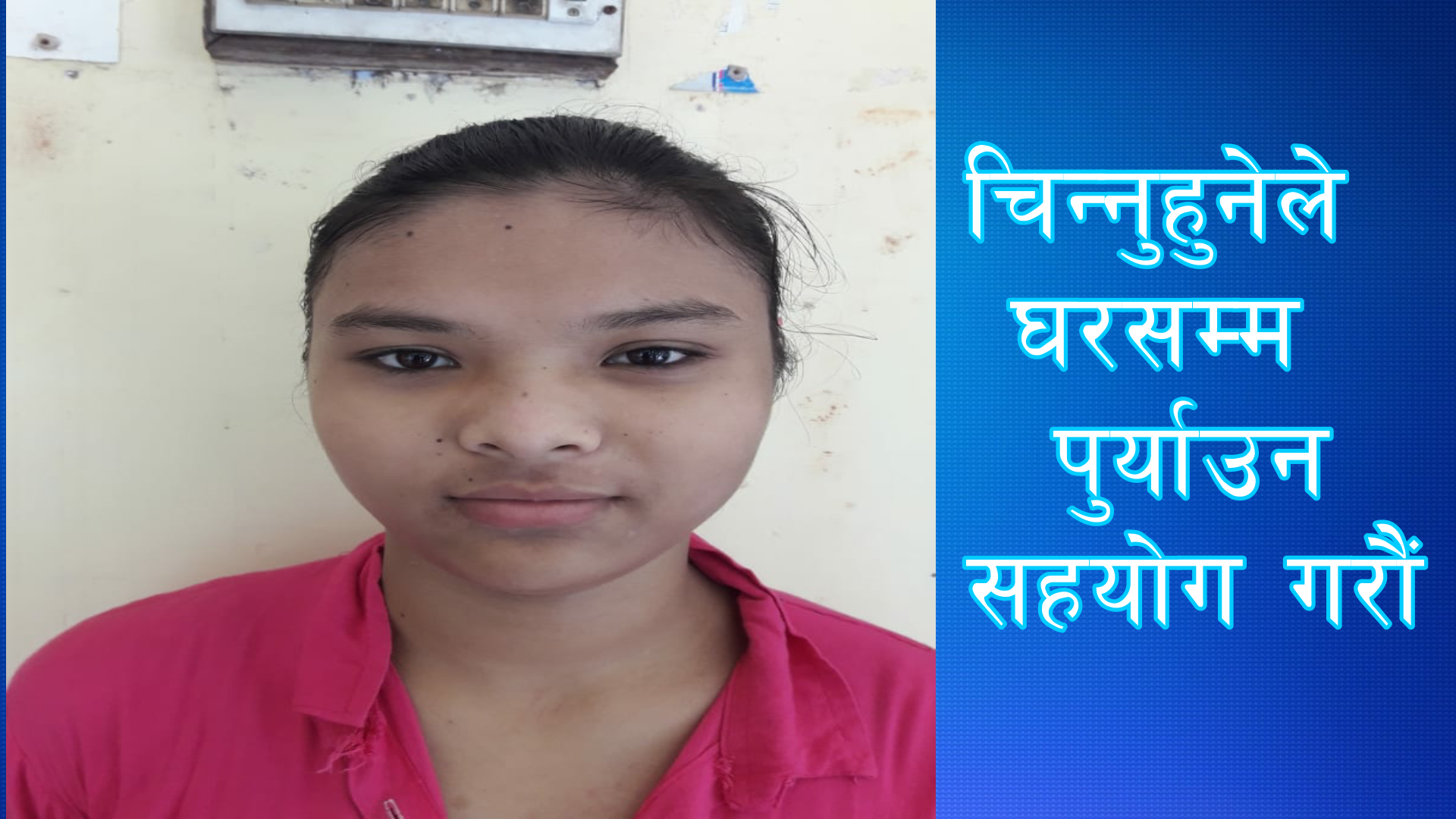 घरको यकीन ठेगाना थाहा नहुँदा विगत 4 वर्षदेखि एक बालिका आश्रममा रहँदै आएकी कैलालीको सुख्खडकी एक बालिका आफ्नो घर फर्किन पाएकी छैनिन । 11 वर्षको उमेरमा हराएर उत्तर प्रदेशको कानपुरको एक बालिका आश्रममा पुगेकी प्रियंका अहिले 15 वर्षकी भएकी छिन । आश्रमले त्यसयता उनको परिवारको खोजीका लागि कयौं प्रयास गरेपनि केही थाहा नहुँदा अहिले आफन्त नेपाललाई परिवार खोज्ने जिम्मा दिइएको छ । आफन्त नेपालका अनुसार प्रियंका चौधरी नाम बताउने उनले बुवाको नाम राम प्रसाद र आमाको नाम सिता रानी बताएकी छिन । उनले आफ्नो घर करैचा, सुख्खड, कैलाली मात्र बताएकाले उनको परिवारलाई खोज्न समस्या भएको छ । उनले आफ्नो भाईको नाम देवराज, बहिनीको नाम विनीता र काकाको नाम राम बहादुर बताएकी छिन । प्रियंकाले दिएको जानकारी अनुसार उनका बुवाले मदिरा सेवन गरि घरमा झगडा गर्ने गरेकाले उनकी आमाले 4 वर्षपहिले उनलाई लिएर अयोध्याको रामपेरी लिएर आएकी थिइन । उनिहरु त्यहा रहेका बेला जानकी महल मन्दीरमा खाना खाने गरेका थिए । त्यहाँ उनिहरु एक महिनादेखि रहिरहेका थिए । त्यस क्रममा उनकी आमाले उनलाई शैम्पु र मम्फली किन्न पठाएपछि उनि घरको बाटो बिराएर हराएकी थिइन । त्यसपछि उनि रेलवे स्टेशन नजिक एक गिरजाशंकर नामक व्यक्तिसँग भेटिएको र त्यसपछि ती व्यक्तिले उनलाई परिवारलाई भेटाइदिने भन्दै कानपुर पुऱ्याएका थिए । कानपुरमा भने रेलवे पुलिसले गिरजाशंकरलाई हिरासतमा लिएर बालिकालाई आश्रमको जिम्मा लगाएको थियो । तस्वीरमा देखिएकी बालिका प्रियंकालाई चिन्नु भएको छ भने दिल्लीमा नवीन जोशीलाई +919716293602 मा र नेपालमा आफन्त नेपाललाई -015533378/015542539 मा सम्पर्क गरि जानकारी दिन सक्नुहुनेछ ।