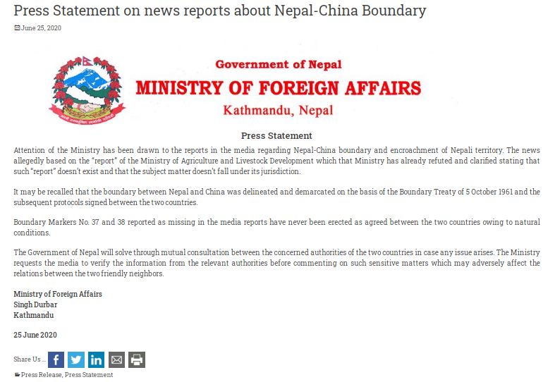 सन् १९६१ अक्टोबर ५ तारिखको सीमा सम्झौता अनुसार नेपाल–चीनबीचको सीमा निर्धारण भएको र समाचारमा बताइए अनुसार चीनसँगको ३७ र ३८ नम्बर सीमा स्तम्भ प्राकृतिक समस्याका कारण निर्माण नगरिएको विज्ञप्तिमा उल्लेख गरिएको छ ।