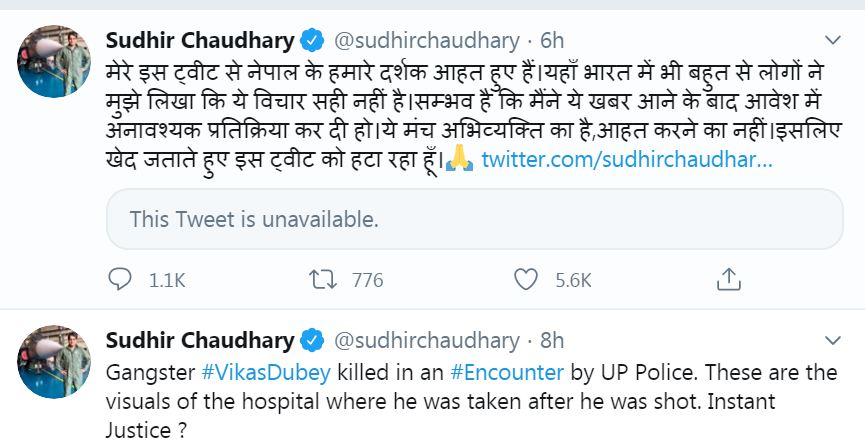 नेपालमा भारतीय नीजि सञ्चार माध्यमहरुमा प्रतिवन्ध लगाईएपछि सामाजिक सञ्जाल र आफ्नो कार्यक्रममा समेत आपत्तिजनक ट्वीट गरेका जी न्यूजका प्रमुख सम्पादक सुधीर चौधरीले आफ्नो ट्वीट हटाएका छन । उनले आज एक ट्वीट गर्दै भनेका छन, ” मेरो यस ट्वीटले नेपालका हाम्रा दर्शकहरुलाई दुःख लागेको छ । कयौं भारतीयले पनि सो विचार सही नभएको मलाई भनेका छन । हुन सक्छ मैले यो खबर आएपछि आवेशमा आएर अनावश्यक प्रतिक्रिया दिएको थिए । यो मञ्च अभिव्यक्तिको हो, दुःख दिने होइन । त्यसैले खेद प्रकट गर्दै यो ट्वीट हटाँउदैछु । “