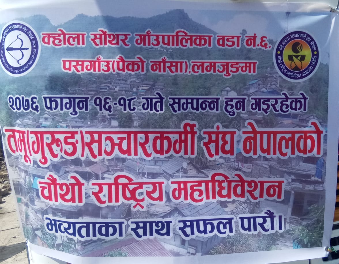 तमु (गुरूङ) सञ्चारकर्मी संघ नेपालको चौथो राष्ट्रिय महाधिवेशन लमजुङको पसगाँउ जिल्लास्थित क्होला सोंथर गाँउपालिका वडा न. 6 मा हुँदैछ। यस महाधिवेशनमा देश तथा विदेशमा रहेका गुरूङ सञ्चारकर्मीहरू एकत्रित भएका छन्। यसै महाधिवेशनमा उपस्थितिको लागि तमु (गुरूङ) सञ्चारकर्मी संघ नेपालका सदस्य तथा नेशनल लाईभ टेलिभिजनकर्मी खुमबहादुर गुरूङसहित लगभग 70 सदस्यीय टोली 2 बसहरूमार्फत् त्यसतर्फ प्रस्थान गरेको छ। पोखरास्थित अमर सिंह चौकमा रहेको लेकाली चुल्हो घरमा सम्पूर्ण तमु सञ्चारकर्मीहरू भेला भई साढे 12 बजे लमजुङको पसगाँउ तर्फ प्रस्थान गरेको हो।