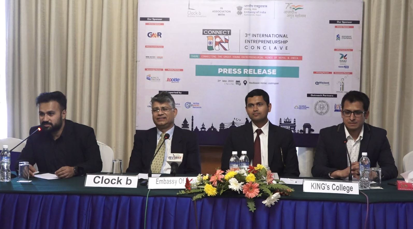 युवा उद्यमशीलता प्रवद्र्धन गर्ने उद्देश्यले ‘कनेक्ट इन’को तेस्रो संस्करणअन्तर्गत तेस्रो अन्तर्राष्ट्रिय उद्यमशीलता सम्मेलन यही बुधबार आयोजना गरिने भएको छ । क्लक वि विजनेस इनोभेशन्स् र काठमाडौँस्थित भारतीय दूतावासको सहकार्यमा यही चैत ९ गते सम्मेलनको आयोजना गर्न लागिएको सोमबार काठमाडौंमा आयोजित पत्रकार सम्मेलनमा जानकारी दिइएको छ । सम्मेलनमा ३०० भन्दा बढी नेपाली तथा भारतीय स्टार्टअप, उद्यमी, लगानीकर्ता, विज्ञ, उच्चपदस्थ नेपाली तथा भारतीय अधिकारीको सहभागिता हुने बताइएको छ । सम्मेलनमा उत्कृष्ट चार उद्यमीले नेपाल र भारतका प्रख्यात उद्यमीका बीच आयोजना हुने अन्तिम प्रतिस्पर्धामा आफ्नो व्यावसायिक विचार प्रस्तुत गर्ने नेपालका लागि भारतीय दूतावासका प्रथम सचिव अभिषेक उपाध्यायले जानकारी दिनुभयो । सम्मेलनको सूचना तथा सञ्चार प्रविधिमन्त्री ज्ञानेन्द्रबहादुर कार्की र नेपालका लागि भारतीय राजदूत विनयमोहन क्वात्राले संयुक्त रुपमा उद्घाटन गर्ने कार्यक्रम रहेको छ ।