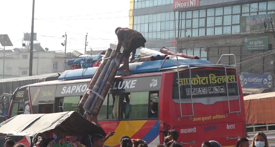 दसैं सुरु भएसँगै काठमाडौं उपत्यकाबाट बाहिरिनेहरुको चाप बढेको छ । दशैंको टीकाको दिन नजिकिंदै जादा काठमाडौं छाड्नेहरुको संख्या ह्वात्तै बढेको हो । काठमाडौंबाट बाहिरिनेहरुको चाप बढेसँगै यहाँका मुख्य सडक अस्तव्यस्त भएका छन् । यात्रुले भरिभराउ लामो दूरीका सवारी साधन काठमाडौंबाट छुट्न थाल्दा जाम नै भएको छ । काठमाडौंबाट बाहिरिने मुख्य नाकाहरु कलंकी, बल्खु, कोटेश्वर, बालाजु लगायतका क्षेत्रमा घर फर्किनेहरुको सोमबार बिहानैदेखि ठूलो भीड लागेको छ । शिक्षा, रोजगारी तथा व्यवसायिक कामले घर बाहिर रहेकाहरु दशैंमा आफ्नै गाउँ फर्कने गरेका कारण काठमाडौंबाट बाहिरिनेहरुको भीड बढेको हो । कोरोना महामारीको जोखिमकै बीच पनि मानिसहरु काठमाडौं उपत्यका लगायतका सहरबाट घर फर्किरहेका छन् । स्वदेश तथा विदेशमा रहेकाहरु घर फिर्तीले आफन्तजनको अनुहार मात्रै होइन गाउँघर नै उज्यालो बनाउने गर्दछ ।