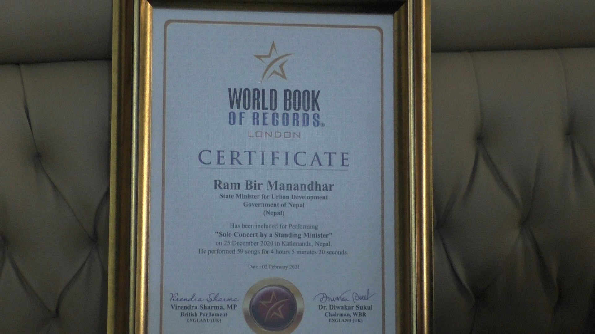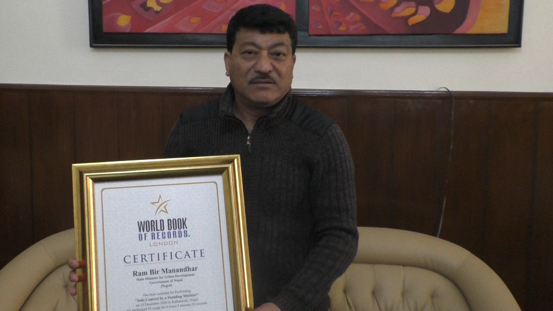 बहालवाला मन्त्रीको रुपमा लगातार चार घण्टा पाँच मिनेट २० सेकेण्ड गीत गाएर विश्व कीर्तिमान कायम गर्नु भएका शहरी विकास राज्यमन्त्री रामवीर मानन्धरलाई नयाँ दिल्लीमा कीर्तिमान कायम गरेको प्रमाणपत्र प्रदान गरिएको छ ।