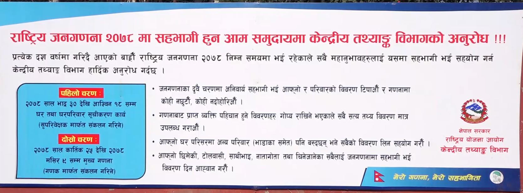 देशभर १२ औँ राष्ट्रिय जनगणना प्रारम्भ भएको छ । बिहीबार शीतल निवासमा पुगेको गणकको टोलीलाई राष्ट्रपति बिद्यादेवी भण्डारीले आफ्नो परिवारको तथ्यांक उपलब्ध गराउँदै ‘राष्ट्रिय जनगणना २०७८’ को औपचारिक शुरुवात गर्नुभएको हो । देशभर गणकहरू जनताका घर–घरमा पुगेर जनगणना गरिरहेका तथ्याङ्क बिभागले जनाएको छ । ‘मेरो जनगणना मेरो सहभागिता’ नारासहित शुरु भएको जनगणना मंसिर ९ गते सकिँदैछ । देशभरको जनगणना गर्न ४० हजार गणक र ८ हजार ५ सय सुपरिवेक्षक खटाइएको बिभागका निर्देशक केशव कुमार गौतमले जानकारी दिनुभयो । देशभरमा ८७ वटा जिल्ला स्तरका जनगणना कार्यालय स्थापना गरेको उहाले बताउनुभयो । गौतमले तथ्याङ्को गुणस्तर कायम हुने गरि जनगणना हुने उल्लेख गर्नुभयो । उहाले तथ्याङ्क संकलन गर्न आउनेलाई सहि तथ्याङ्क दिएर सहयोग गर्न आग्रह पनि गर्नुभयो । यसैबीच प्रधानमन्त्री शेरबहादुर देउवाले राष्ट्रिय जनगणना, २०७८ मा गणकहरूलाई सही विवरण उपलब्ध गराएर राष्ट्रको नीति निर्माणका लागि अपरिहार्य सूचना सङ्कलन गर्ने कार्यमा महत्वपूर्ण भूमिका निर्वाह गर्न सम्पूर्ण देशवासीलाई आग्रह गर्नुभएको छ । उहाले जनगणनाले व्यक्तिको गणना मात्र नगरी देश विकासको समग्र मार्गचित्र पनि तय गर्ने उल्लेख गर्नुभएको छ । प्रधानमन्त्री देउवाले जनताले दिएका सम्पूर्ण व्यक्तिगत विवरण तथ्याङ्क ऐन, २०१५ बमोजिम गोप्य रहने भएकाले आआफ्नो घरमा आउने गणकलाई सही विवरण उपलब्ध गराउन अनुरोध गर्नुभएको छ ।