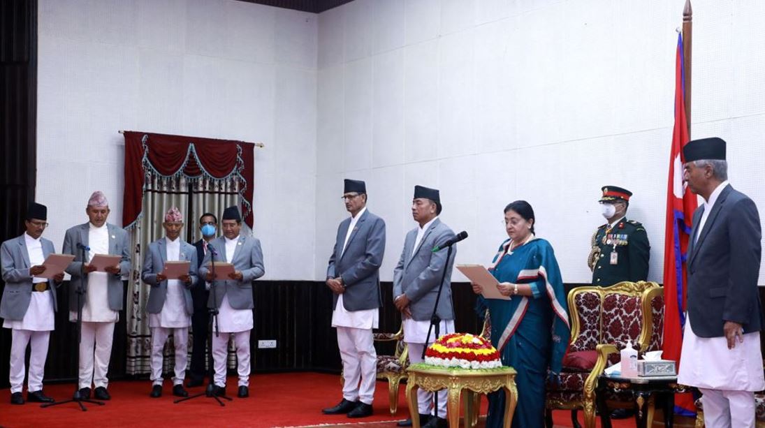 सोमबार बिहान राष्ट्रपति कार्यालय शीतल निवासमा आयोजित कार्यक्रममा जीवनराम श्रेष्ठ, मेटमणि चौधरी, भवानीप्रसाद खापुङ र शेरबहादुर कुँवरले मन्त्रीको शपथ लिएका हुन्। आइतबार नियुक्त भएका नयाँ मन्त्रीहरूले आज बिहानै शपथ लिएका छन्। मन्त्रीहरूलाई राष्ट्रपति विद्यादेवी भण्डारी र राज्यमन्त्रीलाई प्रधानमन्त्री शेरबहादुर देउवाले पद तथा गोपनियताको शपथ दिलाए। यस्तै, हिराचन्द्र केसीले राज्यमन्त्रीको शपथ लिएका छन्। श्रेष्ठले संस्कृति, पर्यटन तथा नागरिक उडड्यन, चौधरीले शहरी विकास, खापुङले स्वास्थ्य तथा जनसंख्या, कुँवरले श्रम, रोजगार तथा सामाजिक सुरक्षामन्त्री र केसीले स्वास्थ्य राज्यमन्त्रीको शपथ लिएका राष्ट्रपतिका प्रेस विज्ञ टीका ढकालले बताए। प्रधानमन्त्री देउवाले आइतबार साँझ कांग्रेस, माओवादीका मन्त्रीलाई यथावत राख्दै एकीकृत समाजवादीले सिफारिस गरेकालाई समेटेर मन्त्रिपरिषद् पुनर्गठन गरेका थिए।