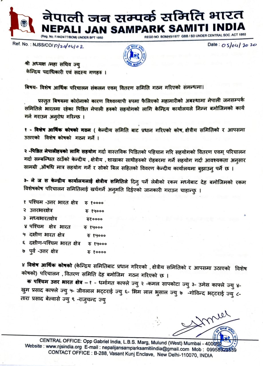 नेपाली जनसम्पर्क समिति भारतले लकडाउनका कारण समस्यामा परेका नेपालीहरुका लागि विशेष आर्थिक कोषको गठन गर्दै तत्काल सहयोग गर्न भन्दै आफ्ना 7 वटै क्षेत्रीय समितिलाई निर्देशन दिएको छ । नेजस भारतले भारतभरका आफ्ना समितिहरुलाई 7 क्षेत्रमा विभाजन गरेको छ । 7 वटै क्षेत्रमा तत्कालका लागि न्यूनतम 10 हजार रुपैँया जम्मा हुनेगरि कोषको गठन गर्दै सदस्यहरु समेत तोकेको छ ।