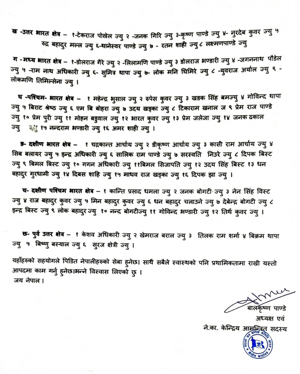 केन्द्रीय र क्षेत्रीय समितिबाट प्रदान कोष र आपसमा उठाएको रकमबाट विशेष कोषको गठन गर्ने भनिएको छ । पिडित नेपालीहरुलाई सहयोग गर्दा एरियाका केन्द्रीय र क्षेत्रीय शाखाका पदाधिकारीहरुको रोहबरमा वास्तविक पीडितको पहिचान गरि आवश्यक्ता अनुसार मात्रै सामग्री वितरण गरि सोको विवरण केन्द्रीय कार्यालयमा बुझाउन केन्द्रीय कार्यालयले निर्देश गरेको छ ।