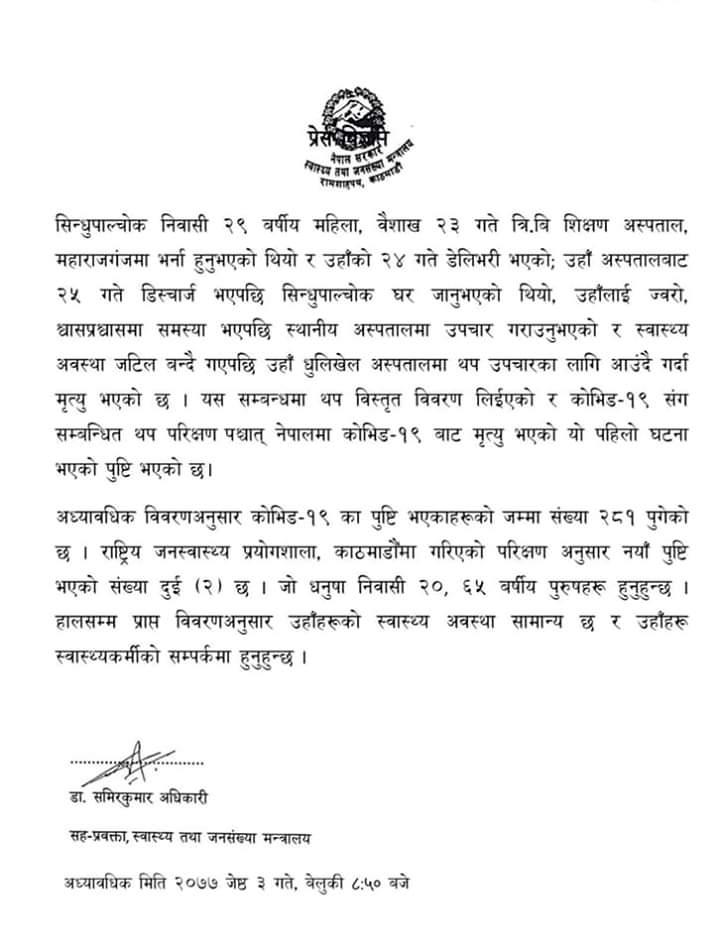 गत बैशाख 24 गते महाराजगन्जस्थित त्रिवि शिक्षण अस्पतालमा भर्ना भएकी महिला 24 गते सुत्केरी भएकी थिइन्। 25 गते अस्पतालबाट ‘डिस्चार्ज’ भएर सिधुपाल्चोक घर गएकी उनिमा ज्वरो र श्वास प्रश्वासमा समस्या देखिएको थियो। स्वास्थ्यमा जटिल समस्या भएपछि धुलिखेल अस्पताल भर्ना भएकी उनको गएको बिहीबार मृत्यु भएको अस्पतालले जनाएको छ।