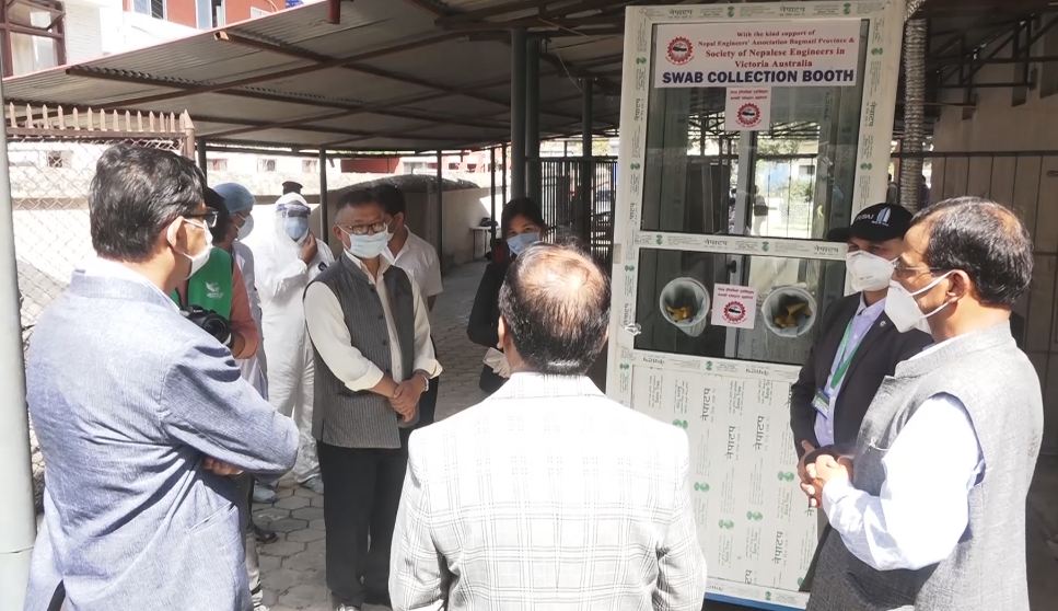 नेपाल इन्जिनियर्स एसोसिएसन बागमती प्रदेशले टेकु अस्पताललाई आधुनिक स्वाब कलेक्सन पीपीई बुथ उपलब्ध गराएको छ। कोरोना भाइरस (कोभिड-19) को नमुना संकलनका लागि प्रयोग गर्न इन्जिनियर्सहरुले स्वाब कलेक्सन पीपीई बुथको निर्माण गरी शुक्रराज ट्रपिकल तथा सरुवारोग अस्पताललाई उपलब्ध गराएका हुन्। करिब 1 लाख रुपैयाँको लागतमा निर्माण गरिएको उक्त बुथ बिहीबार नेपाल इन्जिनियर्स एसोसिएसन बागमति प्रदेशले अस्पताललाई उपलब्ध गराएको छ। आधुनिक प्रविधिको प्रयोग गरि निर्माण गरिएको उक्त बुथमा बिरामी र स्वास्थ्यकर्मी बीच संबाद गर्न माइक जडान गरिएको छ। यस्तै बुथमा हावा पास गर्नको लागि पछाडिपटिको भागमा पंखा जडान गरिएको छ। बुथ हस्तान्तरण कार्यक्रममा नेपाल इन्जिनियर्स एसोसिएसन बागमती प्रदेशका अध्यक्ष नन्द बन्जाडेले कोभिड-19 सँग अग्रपंक्तिमा रहेर काम गर्ने स्वास्थ्यकर्मीको जोखिम न्यूनिकरणका लागि इन्जिनियर्सहरुको समेत भूमिका होस भन्ने उद्देश्यले बुथ निर्माण गरी उपलब्ध गराइएको बताउनुभयो।