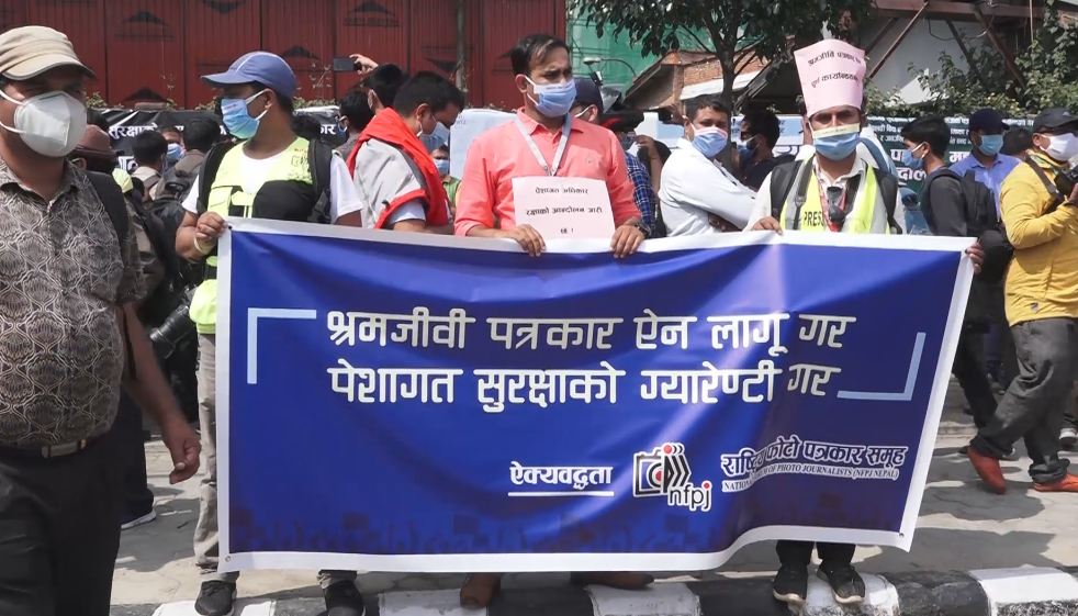 पेशागत सुरक्षाको ग्यारेण्टीको माग गर्दै नेपाल पत्रकार महासंघले शुक्रबार राजधानीमा विरोध प्रदर्शन गरेको छ । श्रमजीवी पत्रकार ऐन लागु गर्नुपर्ने, पेशागत सुरक्षाको ग्यारेण्टी गर्नुपर्ने माग गर्दे महासंघले प्रदर्शन गरेको हो । लकडाउनको अवधिमा श्रमजीवी पत्रकारहरुलाई जागिरबाट निकाल्ने, बिना तलब विदामा राख्ने, पारिश्रमिक कटौती गर्ने समस्या देखिएको भन्दै राजधानीको बबरमहलमा प्रदर्शन गरिएको हो । पत्रकारहरुलाई कार्यालयमा काम गर्ने वातावरण नदिने, जिम्मेवारी विहिन बनाउने जस्ता समस्या विभिन्न सञ्चारगृहमा देखिएकाले महासंघले प्रदर्शन गरेको छ । पेशागत सुरक्षाको ग्यारेण्टी नहुँदासम्म आन्दोलन जारी रहने महासंघका अध्यक्ष गोविन्द आचार्यले बताउनुभयो । श्रमजीवीहरुको मुद्धामा अन्तिम समयसम्म लड्ने प्रतिवद्धता जनाउँदै उहाँले कुनै पनि ढंगले मिडिया मालिकहरुसँग सम्झौता नगर्ने बताउनुभयो । अबको आन्दोलन श्रमजीवी पत्रकार ऐन लागु नभएका मिडिया हाउसमा केन्द्रीत हुने उहाँले बताउनुभयो ।