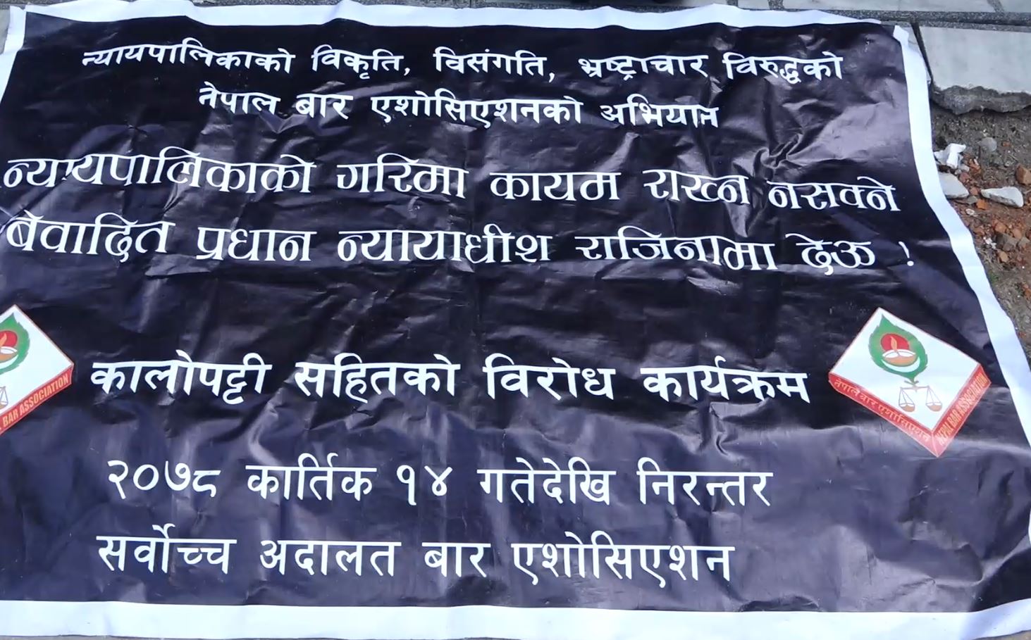 न्यायलयको शुद्धिकरण र प्रधानन्यायाधीश चोलेन्द्र शमशेर जबराको बहिर्गमनको माग गर्दै नेपाल बार एसोसियसनले मंगलबार पनि बिरोध प्रदर्शन गरेको छ । यसअघि सर्वोच्च परिसरमा बिरोध गर्दै आएको बारले मंगलबारदेखि भने बारको प्राङ्गणमा विरोध जनाएको हो । न्यायपालिकाको गरिमा कायम राख्न नसक्ने विवादीत प्रधानन्यायधिश राजीनामा देउ भन्दै कालोपट्टी सहित बिरोध गरिएको बारले जनाएको छ । बारका अध्यक्ष चण्डेश्वर श्रेष्ठले प्रतिनिधिसभामा महाभियोगमाथिको प्रस्तावमाथि छिटो छलफल हुनुपर्ने र उचित निस्कने विश्वास गरेको बताउनभयो । न्यायपालीकाको पहरेदारको भूमिका बारले निभाएको भन्दै उहाले आागमी दिनमा पनि न्यायलयको सुद्धिकरणका लागि निरन्तर कार्यक्रम गर्ने बताउनुभयो । उहाले न्यायपालिकाबाट स्वतन्त्र, निष्पक्ष, स्वच्छ, निर्भिक ढंगबाट न्याय सम्पादन हुनुपर्ने बताउनुभयो ।
