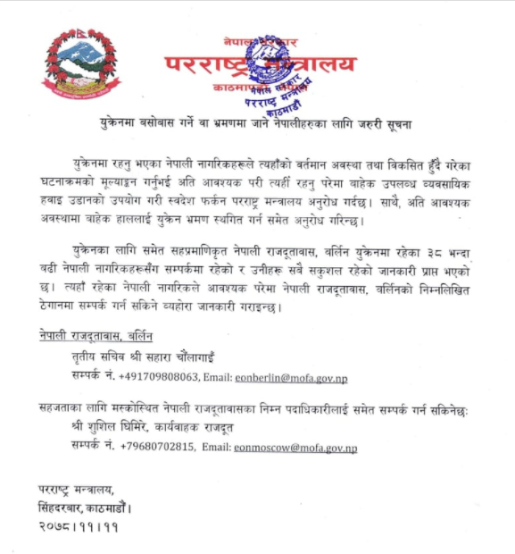 युक्रेनमा रहेका नेपालीहरूलाई सरकारले नेपाल फर्कन र नेपालबाट त्यहाँ भ्रमणमा नजान आग्रह गरेको छ । परराष्ट्र मन्त्रालयले बुधबार एक सूचना जारी गर्दै यस्तो आग्रह गरेको हो । रुसले युक्रेनमाथि आक्रमण सुरु गरिसकेको कुरा आइरहेका बेला सरकारले अत्यावश्यक काम बाहेकका नेपालीलाई युक्रेनमा नबस्न र नेपालबाट समेत अत्यावश्यक बाहेकको अवस्थामा युक्रेनको भ्रमण नगर्न आग्रह गरेको हो । यस्तै अहिलेसम्म युक्रेनका लागि समेत सहप्रमाणिकृत बर्लिन् स्थित नेपाली राजदूतावासले युक्रेनमा रहेका ३८ भन्दा बढी नेपाली नागरिकहरूसँग सम्पर्क भएको उनीहरू सकुशल रहेकोसमेत परराष्ट्रले जनाएको छ । यस्तै कुनै समस्या परेमा बर्लिन् स्थित दूतावासमा सम्पर्क गर्न भन्दै मन्त्रालयले सम्पर्क ठेगानासमेत उपलब्ध गराएको छ ।