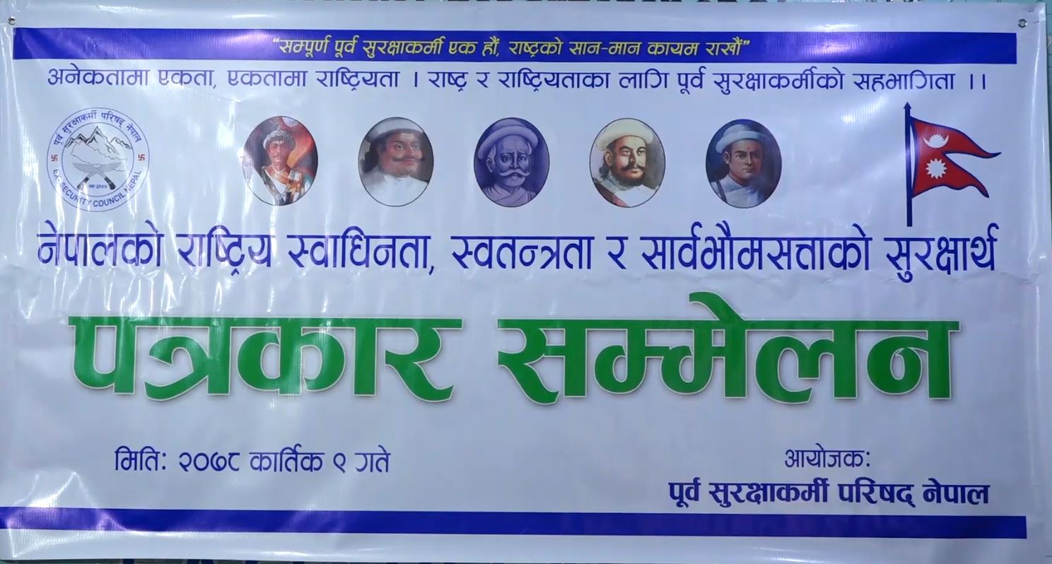 नेपालको राष्ट्रिय स्वाधिनता, स्वतन्त्रता र सार्भभौमिकता माथिको प्रहार रोक्न सम्पूर्ण नेपाली एकजुट हुन पूर्व सुरक्षाकर्मी परिषद्ले आह्वान गरेको छ । मंगलबार काठमाडौंमा पत्रकार सम्मेलन गर्दै परिषद्ले राष्ट्र र राष्ट्रियताको सुरक्षा गर्न आम नेपालीलाई एकजुट हुन आग्रह गरेको हो । कार्यक्रममा पुर्व डिआईजी रमेश खरेलले नेपाललाई भुटानी ढाँचामा लैजान भारतले निरन्तर गरिरहेको प्रयास र नेपाली जनताको सार्वभौमसत्ता माथि सधै खेलिरहने भारतको मनसाय कायमै रहेको बताउनुभयो । भारतसंग मैत्रीपूर्ण सम्बादबाट समस्याको समाधान खोजिनुपर्ने समेत उहाले बताउनुभयो । राष्ट्रियता बचाई राख्न कुटनीतिक निकाय र गृह प्रशासन चनाखो हुनुपर्ने जनाउँदै उहाले पूर्व सुरक्षा निकायमात्रै नभई हरेक नेपालीमा राष्ट्रियता जाग्नुपर्ने बेला आईसकेको बताउनुभयो । त्यस्तै, कार्यक्रममा बोल्दै पूर्व जर्नेल डा. प्रेमसिह बस्न्यातले विकासका नाममा एमसीसी भित्राउन लागेको आरोप लगाउनुभयो । सार्वभौम स्वतन्त्रता र स्वाधिनतालाई कुल्चने भु्टानी मोडलको राजसंस्था आवश्यक नरहेको उहाको भनाई छ । यसैगरी, कार्यक्रममा सामाजिक अभियन्ता राजेन्द्र केशरी पाण्डेले नेपाल कहिल्यै कसैको गुलाम नभएको भन्दै राष्ट्रियताको सवालमा प्रश्न उठाउछ भने पुर्व सुरक्षाकर्मी कुनै हालतमा चुप नबस्ने बताउनुभयो ।