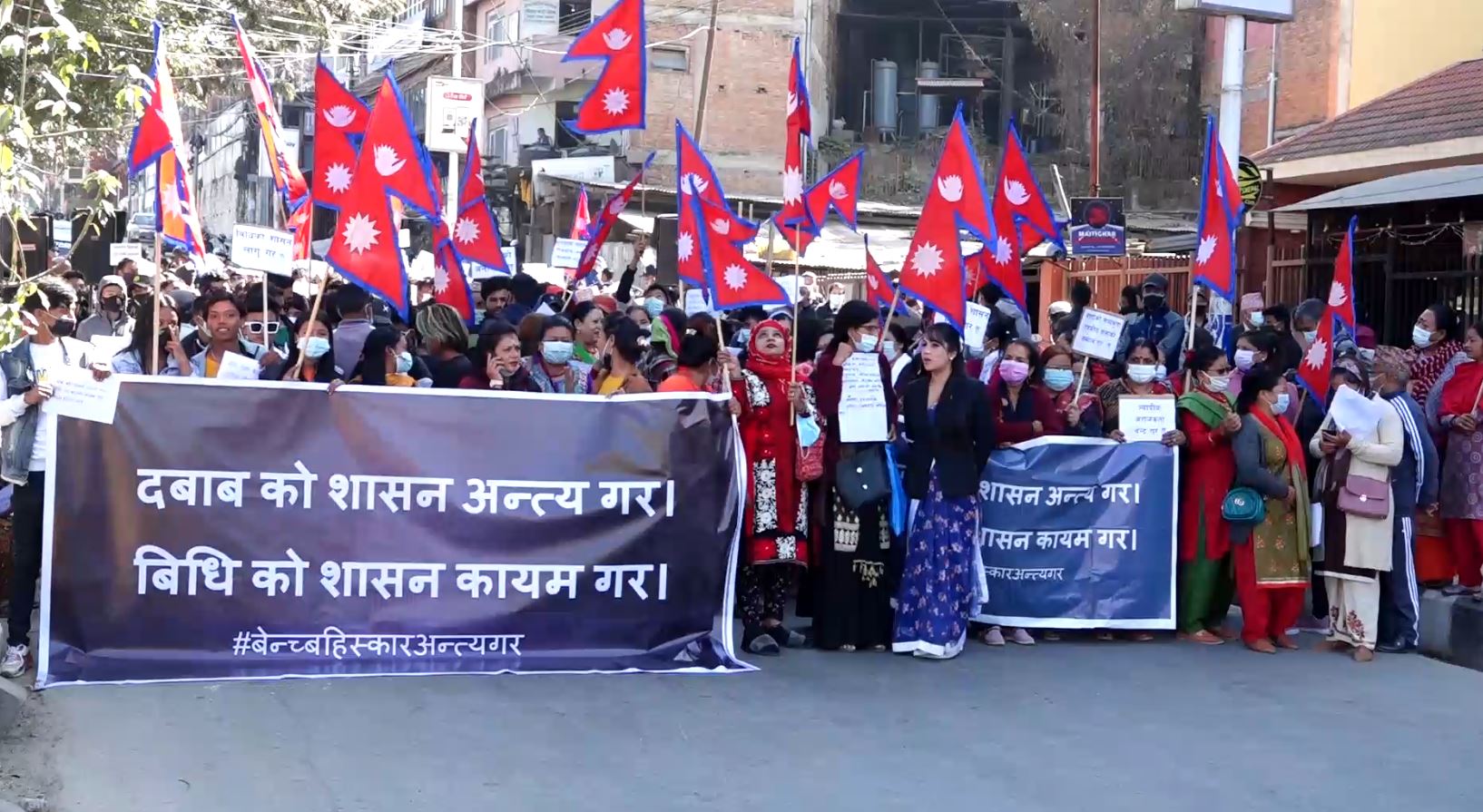 प्रधानन्यायाधीशविरुद्ध सर्वोच्च अदालतकै न्यायाधीशहरुले बेन्च बहिष्कार गरेको भन्दै माइतीघरमा प्रदर्शन गरिएको छ । बेन्च बहिष्हार अन्त्य गर भन्दै एक समूहले काठमाडौंको माइतिघरमा बिरोध प्रदर्शन गरेका हुन् । उनीहरुले दबाबको शासन अन्त्य गर, विधिको शासन कायम गर भन्दै नारावाजी गरेका थिए । प्रदर्शनमा सहभागी भएकाहरुले न्याय पाउने नागरिकको हकअधिकार बञ्चित गर्न नपाइने भन्दै विरोध जनाएका थिए ।