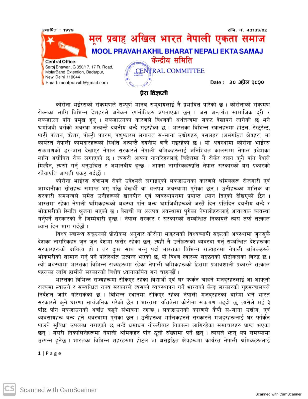 “लकडाउनका कारणले विश्वको अर्थतन्त्रमा संकट देखापर्न लागेको छ भने श्रमजिवी वर्गको अवस्था अत्यन्तै दयनीय बन्दै गइरहेको छ । भारतका विभिन्न स्थानहरुमा होटल, रेस्टुरेन्ट, पार्टी फंशन, क्रेशर, पोल्ट्री फारम, पशुफारम लगायत स–साना उद्योगहरु, पसलहरु (असंगठित क्षेत्रहरु) मा कार्यरत नेपाली कामदारहरूको स्थिति अत्यन्तै दयनीय बन्दै गइरहेको छ ।” प्रेस विज्ञप्तीमा उल्लेख छः “यो अवस्थामा कोरोना भाईरस संक्रमणको डर–त्रास देखाएर नेपाल सरकारले नेपाली श्रमिकहरुलाई अनिश्चित कालसम्म नेपाल प्रवेशका लागि अघोषित रोक लगाएको छ । त्यसरी आफ्ना नागरिहरुलाई बिदेशमा नै रोकेर राख्न कुनै पनि देशले मिल्दैन, त्यसो गर्नु अनुउचित र अमानवीय हुन्छ । आफ्ना नागरिकहरुप्रति नेपाल सरकारको यस प्रकारको रवैयाप्रति आपत्ती प्रकट गर्दछौं ।”