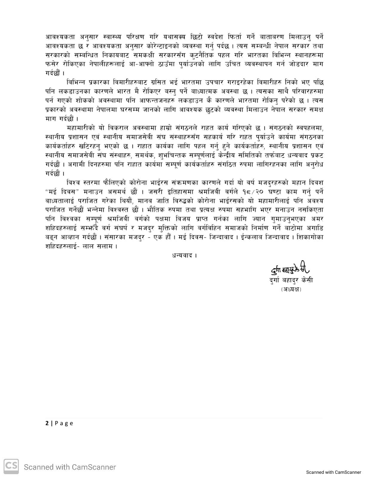 विश्व स्तरमा फैलिएको कोरोना भाईरस संक्रमणका कारणले गर्दा यो वर्ष मजदुरहरुको महान दिवश “मई दिवस” मनाउन असमर्थ अध्यक्ष केसीले विज्ञप्तीमा उल्लेख गर्नुभएको छ । “जसरी इतिहासमा श्रमजिवी वर्गले १८/२० घण्टा काम गर्नु पर्ने वाध्यतालाई पराजित गरेका थियौं, मानव जाति विरुद्धको कोरोना भाईरसको यो महामारीलाई पनि अवश्य पराजित गर्नेछौं भन्नेमा विश्वस्त छौं ।” केसीले विज्ञप्तीमा विश्वास पूर्वक भन्नु भएको छ– “भौतिक रुपमा तथा प्रत्यक्ष रुपमा सहभागि भएर मनाउन नसकिएता पनि विश्वका सम्पूर्ण श्रमजिवी वर्गको पक्षमा विजय प्राप्त गर्नका लागि ज्यान गुमाउनुभएका अमर शहिदहरुलाई सम्झँदै वर्ग संघर्ष र मजदुर मुक्तिको लागि वर्गविहिन समाजको निर्माण गर्ने बाटोमा अगाडि बढ्न आव्हान गर्दछौं ।”