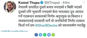 राप्रपा नेपालका अध्यक्ष कमल थापाले भारतबाट दूध आयात गर्ने गठबन्धन सरकारको निर्णय अनुपयुक्त भएको बताएका छन् । उनले सरकारको उक्त निर्णय तत्काल फिर्ता गर्न प्रधानमन्त्री शेरबहादुर देउवाको ध्यानाकर्षण गराएका छन् । सामाजिक संजाल मार्फत उनले भने ‘नेपालमै उत्पादित दूधले बजार नपाएको र बिक्री भएको दूधको पनि भुक्तानी नभएको बेला भारतबाट दूध आयात गर्ने गठबन्धन सरकारको निर्णय अनुपयुक्त छ। किसान र व्यवसायलाई धरासायी पार्ने यो जनविरोधी निर्णय तत्काल फिर्ता गर्न प्रधानमन्त्री शेरबहादुर देउवाको ध्यानाकर्षण गराउँछु ।’