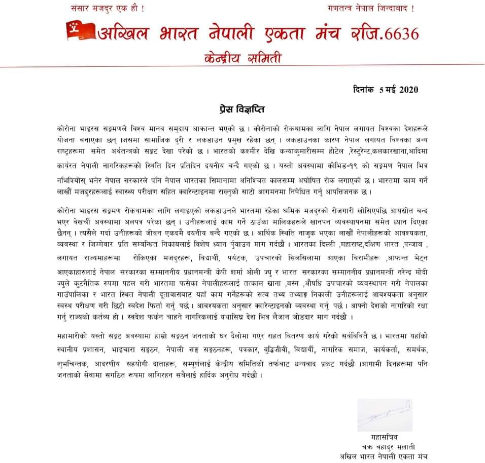 अखिल भारत नेपाली एकता मञ्चले स्वदेश फर्कन चाहने नागरिकहरूलाई यथाशीघ्र नेपाल फर्काउन माग गरेको छ। मञ्चले एक प्रेस विज्ञप्ति जारी गर्दै लकडाउनको कारण समस्यामा परेका र नेपाल फर्किन चाहने नागरिकहरूलाई स्वदेश फर्काउन माग गरेको हो।