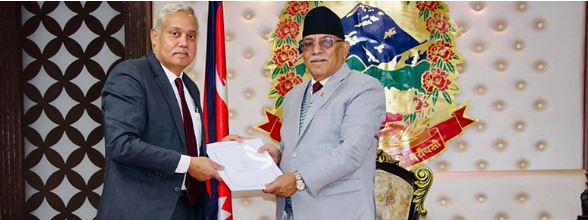 नेपालका लागि भारतीय राजदूत नविन श्रीवास्तवले मोदीले पठाएको बधाई पत्र प्रचण्डलाई हस्तान्तरण गरेका थिए ।