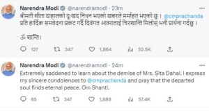 प्रधानम्नत्री मोदीले ट्विट गर्दै सीता दाहालको मृत्युले आफू मर्माहत भएको बताए।