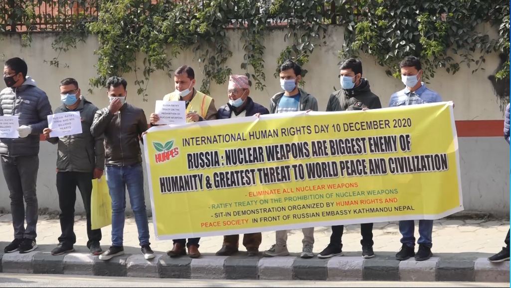 आणविक अस्त्र निषेध सन्धि शिघ्र अनुमोदन गर्न माग गर्दै मानव अधिकारकर्मीहरुले नेपाल स्थित नौ वटा दुवातावास अगाडी एकैसाथ धर्ना प्रदर्शन गरेका छन। मानव अधिकार तथा शान्ति समाजको आयोजनामा काठमाण्डौ र ललितपुरमा रहेका नौ वटा दुतावास अगाडि आणविक अस्त्रको विश्वव्यापी उन्मुलनको माग गर्दै धर्ना प्रदर्शन भएको हो । मानव अधिकारकर्मीहरुले ७२ औँ अन्तराष्ट्रिय मानव अधिकार दिवस पारेर काठमाण्डौस्थित अमेरिका, रुस, चीन, ब्रिटेन, फ्रान्स, भारत, पाकिस्तान, इजरायल र ललितपुर स्थित उत्तर कोरियाली दुतावास अगाडि एकसाथ प्रदर्शन गरेका हुन् । मानव अधिकार तथा शान्ति समाजका संस्थापक सदस्य एवं पूर्व महासचिव कृष्ण कँडेलले जीवजन्तु र मानिसलाई हानी हुने कुनैपनि आणविक अस्त्र राख्न पाइदैन भन्दै प्रदर्शन गरिएको बताउनुभयो । युद्धले विनास बाहेक केहीपनि नगर्ने भएकाले विश्व शान्तिका लागि प्रदर्शन गरिएको उहाँले बताउनुभयो ।