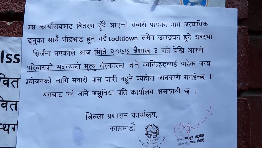 जिल्ला प्रशासन कार्यालय, काठमाडौँले मृत्यु संस्कारमा सहभागि हुन मात्र सवारी पास उपलब्ध गराउने भएको छ। कार्यालयले सवारी पासको अत्याधिक माग भएको र यसले भीडभाड हुन गई लकडाउन उलङघन हुने खतरा बढेपछि सूचना जारी गरी आफ्नो परिवारको सदस्यको मृत्यु संस्कारमा सहभागी हुने बाहेकका कामका लागि सवारी पास नदिने बताएको हो। यस्तै बैशाख 3 गते बुधबार देखि नै यो व्यवस्था लागू भइसकेको समेत सूचनामा उल्लेख छ।