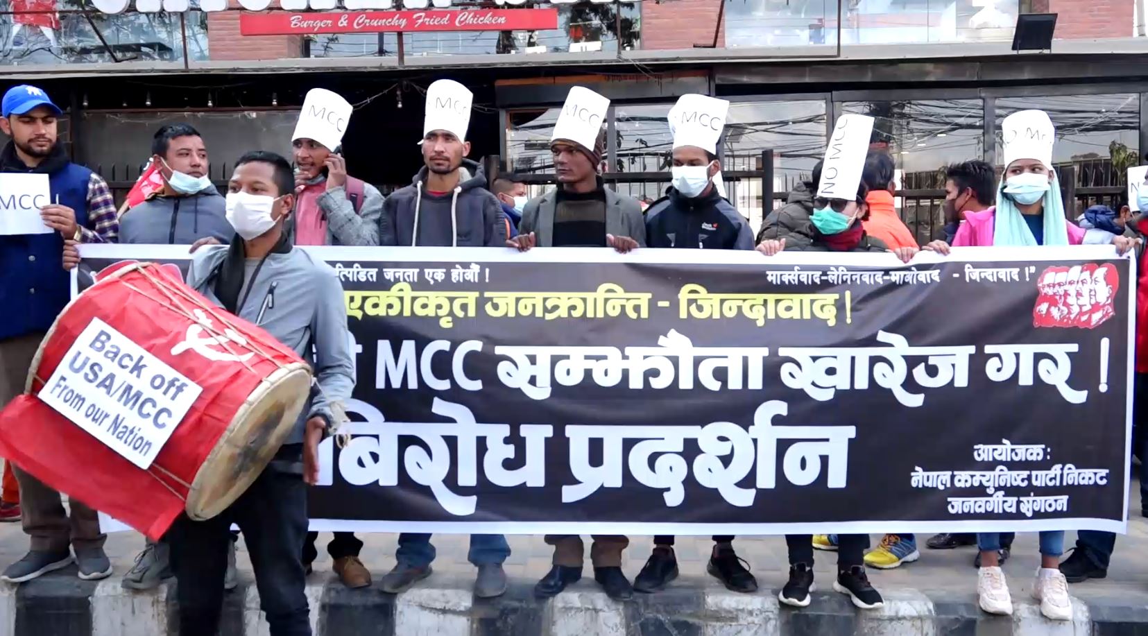 एमसीोसी–सम्झौताविरुद्ध संसद बाहिर रहेका राजनीतिक दलहरुले काठमाडौंमा विरोध प्रदर्शन गरेका छन् । संसद बाहिर रहेका बिभिन्न राजनीतिक दल, विभिन्न संघसंस्था र अभियानहरुको मोर्चा संयुक्त जनआन्दोलनले एमसिसीको बिरोधमा बुधबार काठमाडौको माइतिघरदेखि बानेश्वरसम्म विरोध प्रर्दशन गरेका हुन् । एमसीसी सम्झौतामा नेपालको कानुनभन्दा अमेरिकाका माथि हुने देखिएकाले यसलाई खारेज गर्नुपर्ने उनीहरुको भनाई छ । उनीहरुले एमसीसी अमेरीकी सुरक्षा सैन्य रणनीतिसंग जोडिएको भन्दै राष्ट्रहित बिपरित गरको बताएका छन् । प्रदर्शनमा सहभागीहरुले एमसीसी सम्झौता खारेज गर, गो ब्याक एमसीसी, वैदेशिक हस्तक्षेप बन्द गर लगाएका नारा लगाएका थिए । नेकपा (माले), नेकपा (संयु्क्त), नेपाल कम्युनिष्ट पार्टी, संयुक्त राष्ट्रिय जनआन्दोलन मोर्चा, लगायत विभिन्न संघसंस्थाहरुहले संयुक्त रुपमा बिरोध प्रदर्शन गरेका हुन् । एमसीसी पास गर्ने या नगर्ने भन्ने सम्बन्धमा राजनीतिक दलहरुबीच पनि सहमति जुट्न नसक्दा अघि बढ्न सकेको छैन ।