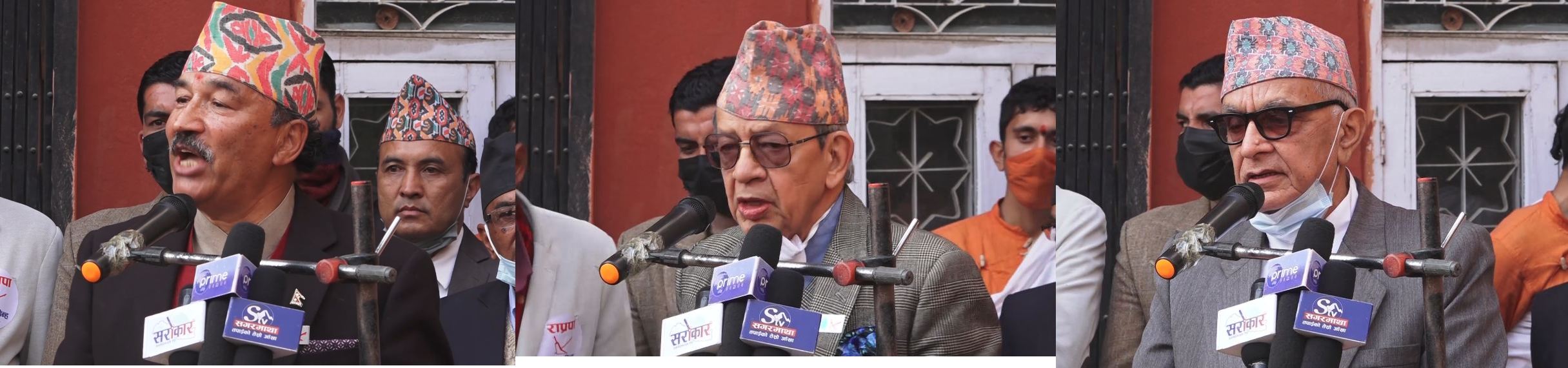 राष्ट्रिय प्रजातन्त्र पार्टीका नेताहरुले मुलुकलाई जोगाउन राजसंस्था अपरिहार्य भएको बताएका छन् । पार्टीको झण्डोत्तोलन तथा चुनाव चिन्ह अनावरण गर्न आयोजित समारोहलाई सम्बोधन गर्दै नेताहरुले हिन्दु राष्ट्र र संवैधानिक राजसंस्थालाई पुनस्थापना गर्न सबै नागरिक उठनुपर्ने बेला आएको बताएका हुन् । राप्रपा अध्यक्ष पशुपति शमशेर राणाले पार्टीले राजसंस्था र हिन्दुराष्ट्र गरी दुईवटा विषयलाई मूल्य मान्यताको रुपमा स्थापीत गरेको बताउनुभयो । उहाँले भन्नुभयो ‘हाम्रो पार्टीले बोल्दै आएको दुईवटा मूल्य मान्यताको पक्षमा हिन्दु धर्म र मूलुक सञ्चालन गर्दा राष्ट्रपतिको ओहोदामा, राष्ट्र प्रमुखको ओहोदामा पुरानै संस्था जसले मुलुकलाई अभिभावकत्व दिन सक्छ त्यसलाई ल्याई पक्षपाति व्यक्तिहरु राख्न हुन्न भन्ने मान्यता प्रति मुलुकभरी आन्दोलन चलिरहेको छ ।’