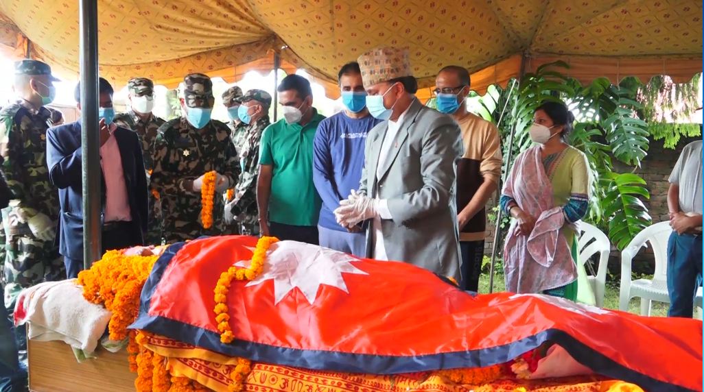 राष्ट्रकवि माधवप्रसाद घिमिरेको पार्थिव शरीरमा उपप्रधानमन्त्री एवं रक्षामन्त्री इश्वर पोखरेलले राष्ट्रिय झण्डा ओढाएर श्रद्धाञ्जली अर्पण गर्नुभएको छ। घिमिरेको निवासमै पुगेर उपप्रधानमन्त्री पोखरेलले राष्ट्रिय झण्डा ओढाएर राष्ट्रकवि घिमिरेलाई श्रद्धाञ्जली अर्पण गर्नुभएको हो। उपप्रधानमन्त्री पोखरेलले राष्ट्रकवि भौतिक रुपमा हामी माझ नभएपनि उहाँले राष्ट्रका लागि गरेका योगदानहरु हामीसँगै रहेको बताउनुभयो । राष्ट्र, राष्ट्रियता, नेपाल, नेपाली र राष्ट्रिय स्वाभिमानको एउटा चेतना जगाउने अगुवा व्यक्तित्वको रुपमा राष्ट्रकविलाई आफुले बुझेको उहाँले बताउनुभयो । उहाँले राष्ट्रका लागि गरेको योगदानलाई सरकारले संस्थागत ढंगले चिरस्थायी बनाउन महत्वपूर्ण निर्णय गर्ने बताउनुभयो ।