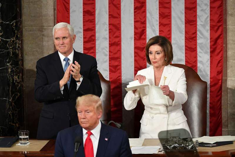 संसदको दुवै सदनमा सम्बोधन गर्न संसदभवन पुगेका ट्रम्पको भाषणको लिखित कपी न्यान्सीले उनको अगाडि च्यातिदिएकी हुन्। आफूले अभिवादनका रुपमा हात मिलाउन हात नदिएका ट्रम्पको विरोधस्वरुप न्यान्सीले उनको अगाडी भाषण च्यातिदिएकी हुन् । यो सँगै सभामुख र राष्ट्रपतिको विवाद सतहमा आएको छ ।