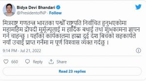राष्ट्रपति विद्यादेवी भण्डारीले भारतको नवनिर्वाचित १५औँ राष्ट्रपति द्रौपदी मुर्मूलाई बधाई दिएकी छन् । राष्ट्रपति भण्डारीले सामाजिक सञ्जाल ट्वीटरमार्फत उनलाई बधाई तथा शुभकामना दिएकी हुन् । विपक्षी दलका उम्मेदवार यशवन्त सिन्हालाई पराजित गर्दै एनडीएकी मुर्मू राष्ट्रपति निर्वाचित भएकी हुन् । भारतको राष्ट्रपति चुन्ने इलेक्ट्रोरल कलेजमा १० लाख ८६ हजार ४३१ मत मूल्य हुन्छ । कुनै पनि उम्मेदवारलाई जितका लागि ५ लाख ४३ हजार १२६ मत मूल्य चाहिन्छ । तेस्रो राउण्डमा मुर्मूले ५ लाख ७७ हजार मत मुल्य कटाएकी थिइन् । उनका प्रतिस्पर्धी सिन्हाले हार स्वीकार गरेका छन् र मुर्मूलाई जितका लागि बधाइ दिएका छन् । झारखण्डकी पूर्व राज्यपाल समेत रहेकी मुर्मू पहिलो आदिवासी र दोस्रो महिला राष्ट्रपति बनेकी छन् । उनले २५ जुलाईमा राष्ट्रपतिको सपथ लिनेछिन् । मुर्मूको कार्यकालमा नेपाल–भारतबीचको सहकार्यले नयाँ उचाई प्राप्त गर्ने विचार राष्ट्रपति भण्डारीले व्यक्त गरेकी छन् । सामाजिक सञ्जाल ट्वीटरमा मार्फत ‘मित्रराष्ट्र गणतन्त्र भारतका पन्ध्रौँ राष्ट्रपति निर्वाचित हुनुभएकोमा महामहिम द्रौपदी मुर्मूज्यूलाई म हार्दिक बधाई तथा शुभकामना ज्ञापन गर्न चाहन्छु । यहाँको कार्यकालमा हाम्रा दुई देश बिचको सहकार्यले नयाँ उचाई प्राप्त गर्नेमा म पूर्ण विश्वास व्यक्त गर्दछु,’ ।