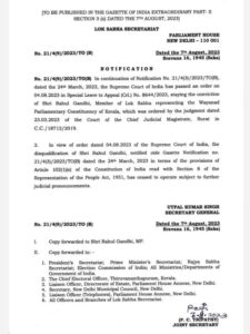 मानहानि मुद्दामा त्यहाँको सर्वोच्च अदालत (सुप्रिम कोर्ट)ले सफाइ दिएपछि उनको सांसद पद पुनर्बहाली भएको थियो । लोक सभाका सभामुख ओम बिडलाले आजै बिहान उनको सांसद पद पुनर्बहाली गरेका थिए ।