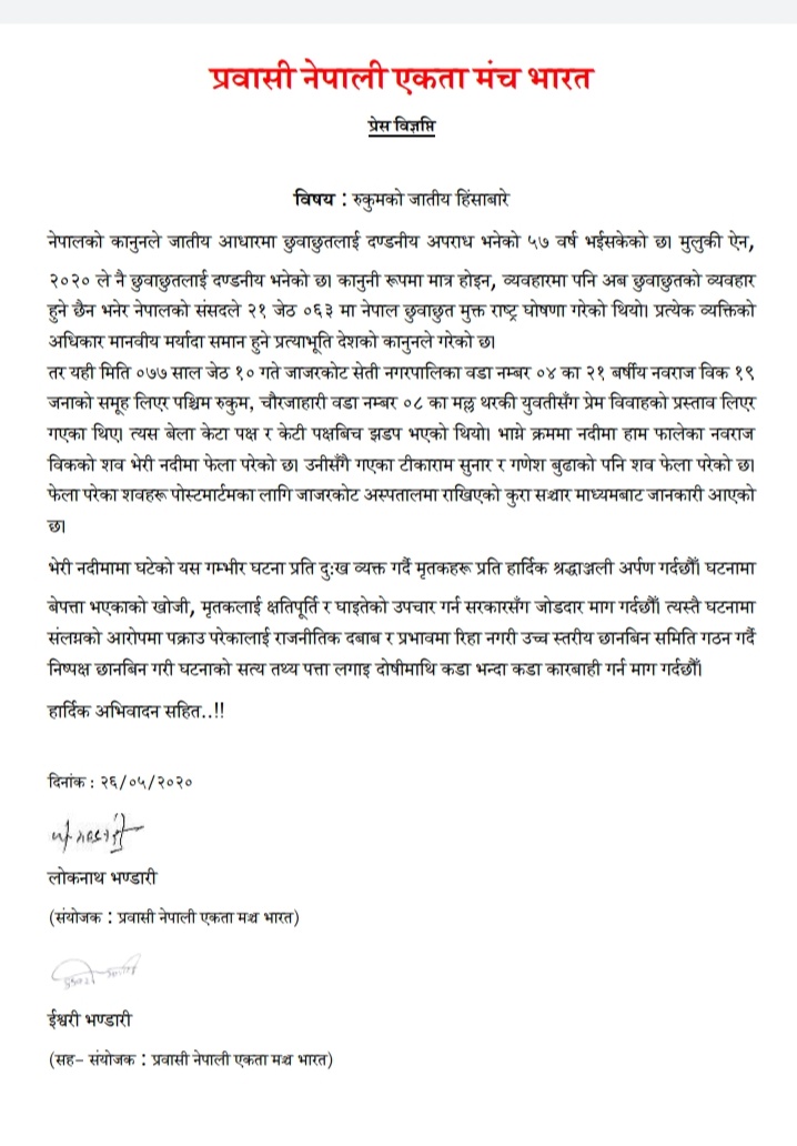 प्रवासी नेपाली एकता मञ्चले पश्चिम रुकुमको चौरजहारीमा घटनाप्रति दुःख व्यक्त गर्दै दोषीहरुलाई कडा कारवाही गर्न माग गरेको छ । मंगलबार एक प्रेस विज्ञप्ति जारी गर्दै प्रवासी नेपाली एकता मंच भारतले नेपालको कानुनले जातीय आधारमा छुवाछुतलाई दण्डनीय अपराध भनेको ५७ वर्ष भईसकेको र नेपालको संसदले २१ जेठ ०६३ मा नेपाल छुवाछुत मुक्त राष्ट्र घोषणा गरिसकेको अवस्थामा रुकुम, चौरजाहारी वडा नम्बर ०८ मा भएको सो घटनाप्रति दुःख व्यक्त गरेको हो ।