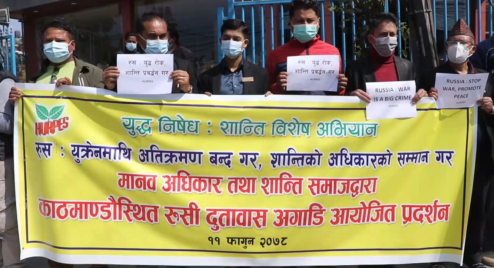 रुसलाई तत्काल युद्ध रोक्न र शान्ति प्रवद्र्धन गर्न विशेष आग्रहसहित मानव अधिकार तथा शान्ति समाजले नेपालस्थित रुसी राजदुतावास वालुबाटार अगाडि प्रदर्शन गरेको छ । प्रदर्शनमा सहभागीहरुले रुस, युक्रेनमाथि अतिक्रमण बन्द गर, तत्काल सैनिक फिर्ता गर, युद्ध रोक, शान्ति प्रवद्र्धन गर भन्दै ध्यानाकर्षण गराएका थिए । प्रदर्शन पश्चात मानव अधिकार तथा शान्ति समाजका तर्फबाट रुसका राष्ट्रपति भ्लादिमिर पुटिनलाई लेखिएको पत्र नेपालस्थित रुसी राजदुतावासका अधिकारीलाई हस्तान्तरण गरिएको समाजले जनाएको छ । प्रदर्शनमा मानव अधिकार तथा शान्ति समाजका संस्थापक सभापति कृष्ण पहाडी, सभापति गोविन्द खनाल, सल्लाहकारहरु होमकान्त चौलागाई र उत्तम पुडासैनी, संस्थापक सदस्य कृष्ण कँडेल,महासचिव रामकृष्ण बरालको सहभागीता रहेको थियो ।