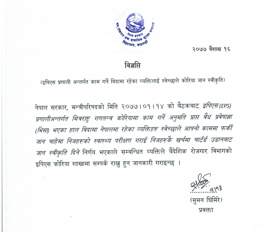 कोरियाको भिसा रहेका बिदामा आएका नेपाली कामदारलाई विमान चार्टर गरी कोरिया पठाउन दिने निर्णय बैशाख 14 गते बसेको मन्त्रीस्तरीय बैठकले भएको श्रम मन्त्रालयले जनाएको छ। रोजगार अनुमति प्रणाली (इपीएस) अन्तर्गत बिदामा आएका इच्छुक कामदारलाई विमान चार्टर गरी पठाउन लागिएको मन्त्रालयका प्रवक्ता सुमन घिमिरेले बताउनुभयो। त्यसका लागि इच्छुक कामदारले वैदेशिक रोजगार विभागको इपीएस कोरिया शाखामा सम्पर्क राख्न अनुरोध गरेको छ।