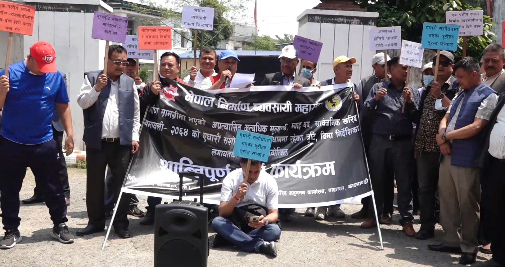 निर्माण सामग्रीहरुमा अप्रत्यासित रुपमा मूल्यवृद्धि हुँदा पनि राज्य मौन रहेको भन्दै निर्माण व्यवसायीहरुले शुक्रबार सार्वजनिक खरिद अनुगमन कार्यालयमा धर्ना दिएका छन् । निर्माण सामग्रीको अप्रत्यासित रुपमा मुल्यवृद्धि भएर निर्माणको काम अगाडि बढाउन नसकिएको अवस्थामा राज्य मौन रहेको भन्दै नेपाल निर्माण व्यवसायी महासंघको अगुवामा निर्माण व्यवसायीहरुले खरिद अनुगमन कार्यालयमा धर्ना दिएका हुन् । महासंघका अध्यक्ष रवि सिंहले अहिले बजारमा भएको अप्रत्यासित मूल्यवृद्धिलाई सम्बोधन गर्न प्रधानमन्त्री लगाएत सरोकारवाला सवैलाई जानकारी गराउन ध्यानाकर्षण गराउदा पनि कुनै सम्बोधन नभएकाले बिरोधमा उत्रन बाध्य भएको बताउनुभयो । त्यस्तै बिमा निर्देशिकाले निर्माण व्यवसायीहरुको हित नगर्ने भएकाले पनि आफुहरुको बिमा समितिमा पनि धर्ना दिनुपरेको उहाले जानकारी दिनुभयो । महासंघले आफुहरुको माग सम्बोधन नभएसम्म निरन्तर रुपमा विरोधका कार्यक्रमलाई जारी राख्ने जनाएको छ ।