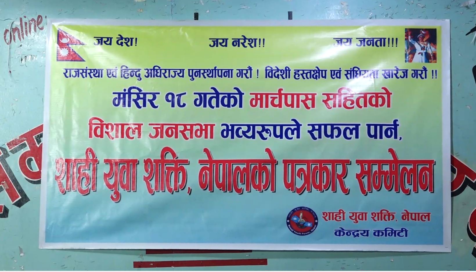 शाही युवा शक्ति नेपालले राजसंस्था र हिन्दूराष्ट्र पूनःस्थापनाको लागि आउने मंसिर १८ गते मार्चपाससहित वसन्तपुरमा विशाल र्याली गर्ने भएको छ । शुक्रबार रिपोर्टर्स क्लब नेपालमा पत्रकार सम्मलन गर्दै धर्मनिरपेक्षताको खारेजी र राजसंस्थाको पूनःस्थापनाको लागि सो कार्यक्रम गर्न लागेको शाही युवा शक्ति नेपालले जानकारी गराएको हो । कार्यक्रममा बोल्दै संस्थाका अध्यक्ष पशुपति खड्काले देश प्रधानन्यायाधीशशले प्रधानमन्त्री नियुक्ती गर्ने अवस्थामा गएको भन्दै अहिलेको अवस्थामा देश राणा शासनको चंगुलमा परेको टिप्पणी गर्नुभयो । उहाँले नेपाली जनतालाई लोकतन्त्रको नाममा झुक्याएर गणतन्त्रको स्थापना गरिएको भन्दै नेपालको राजतन्त्र नेपाली जनताले नभई विदेशी दलालहरुले फालेको आरोप लगाउनुभयो । उहाँले शाही युवा शक्ति नेपालले मंसिर १८ गते गर्न लागि संस्थाले लामो समयदेखि सडक आन्दोलन गरिरहेको भन्दै आफूहरुलाई साथ दिन आग्रह गर्नुभयो । मार्चपासमा विशेषगरि काठमाडौंवासी नेवार समूदायलाई सहभागी भईदिन पनि उहाँले आग्रह गर्नुभयो ।