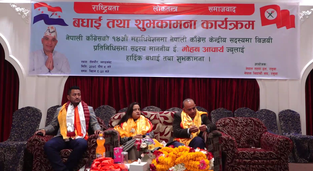 नेपाली कांग्रेसका नव निर्वाचित केन्द्रीय सदस्य मोहन आचार्यले शिक्षा र स्वास्थ्यमा सरकारले प्राथमिकता दिनुपर्ने बताउनुभएको छ । आफ्नो सम्मानमा नेपाल विद्यार्थी सङ्घ र नेपाल तरुण दल जिल्ला कार्यसमिति रसुवाद्वारा संयुक्त रुपमा शुक्रबार काठमाडौंमा आयोजित ‘बधाई तथा सम्मान’ कार्यक्रमलाई सम्बोधन गर्दै उहाँले समृद्ध नेपाल निर्माणका लागि पूर्वाधार विकासमा प्राथमिकता दिनुपर्ने पनि बताउनुभयो । कांग्रेसलाई ठूलो पार्टीमात्र नभई जनताको लोकप्रिय पार्टी बनाउनुपर्ने उहाको भनाई छ । उहाले अग्रजको अनुभव र युवाको जोसलाई सँगै लिएर कांग्रेस अगाडि बढ्ने धारणा राख्नुभयो । आचार्यले कांग्रेसको १४ औँ महाधिवेशन सफल बनाउने र आफूलाई विजयी गराउने देशभरका पार्टीका जिल्ला सभापति, क्षेत्रीय सभापति एवं महाधिवेशन प्रतिनिधिलाई धन्यवादसमेत दिनुभयो ।