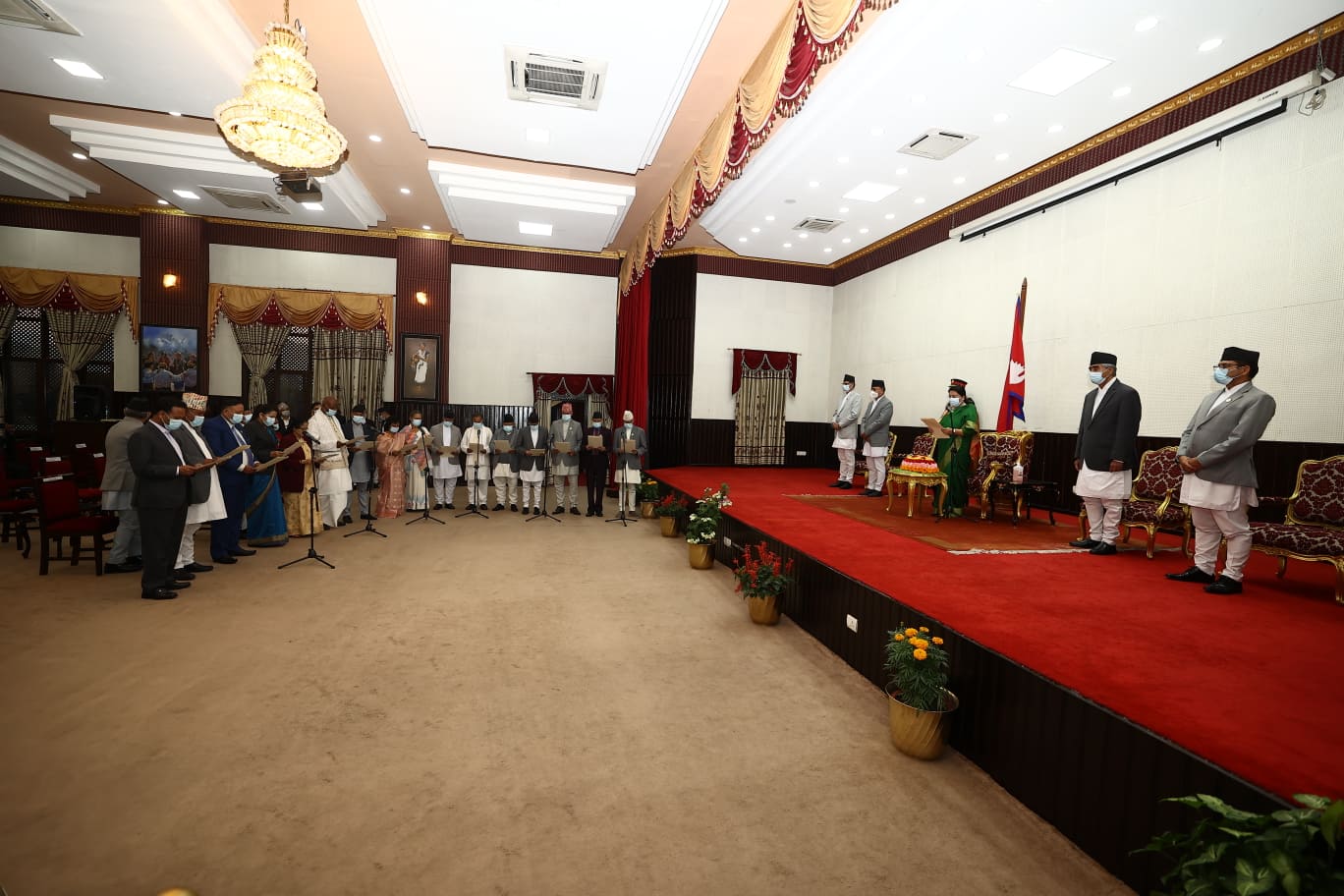 नवनियुक्त मन्त्रीहरुले पद तथा गोपनीयताको सपथ लिएका छन्। राष्ट्रपति भवन शितल निवासमा राष्ट्रपति विद्यादेवी भण्डारीले नव नियुक्त मन्त्रीहरुलाई सपथ खुवाएकी हुन्। १६ मन्त्री र २ राज्यमन्त्री थप गर्दै प्रधानमन्त्री देउवाले मन्त्रिपरिषद् विस्तार गरेका हुन्। नयाँ मन्त्री थपिएसँगै मन्त्रिपरिषदले पूर्णता पाएको हो। नवनियुक्त मन्त्रीहरुमा नेपाली कांग्रेसबाट कानुन न्याय तथा संसदीय मामिला मन्त्रीमा दिलेन्द्रप्रसाद बडू, रक्षामन्त्रीमा मिनेन्द्र रिजाल, खानेपानी मन्त्रीमा उमाकान्त चौधरी, महिला बालबालिका तथा ज्येष्ठ नागरिक मन्त्रीमा रेग्मी भएका छन् । प्रधानमन्त्री तथा कांग्रेस सभापति शेरबहादुर देउवाले यसअघि कानुनमन्त्री रहेका ज्ञानेन्द्रबहादुर कार्कीलाई सञ्चार मन्त्रालयको जिम्मेवारी दिएका छन् ।