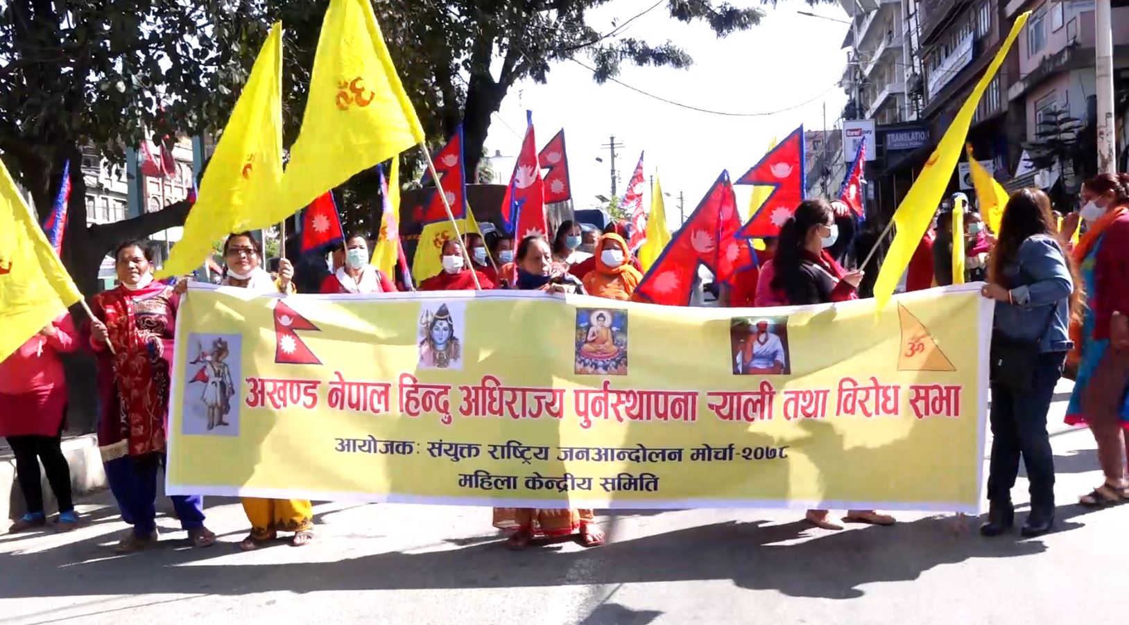 अखण्ड नेपाल हिन्दु अधिराज्य पुर्नस्थापनाको माग गर्दै संयुक्त राष्ट्रिय जनआन्दोलन मोर्चाले सोमबार काठमाडौंमा बृहत ऱ्यालीको आयोजना गरेको छ । मोर्चाको महिला केन्द्रीय समितिले काठमाडौंको माइतिघरमा बृहत ऱ्याली तथा विरोध सभाको आयोजना गरेको हो । तत्कालीन राजा वीरेन्द्र शाह र दलहरूबीच भएको २०४७ सालको संविधानलाई टेकेर गरिएको पाँच बुँदे सम्झौता अक्षरशः पालन गर्न माग गर्दै मोर्चाले आन्दोलन गरेको हो । उनीहरुले न्यायालयभित्रको बेथिति, विसंगति, नेपाल बार एशोसिएशनले सुरु गरेको आन्दोलनको बिरोध पनि गरेका छन् । देशको संकट, भ्रष्टाचारको विरुद्धमा आफूहरु आन्दोलित हुनुपरेको मोर्चाको भनाई छ ।